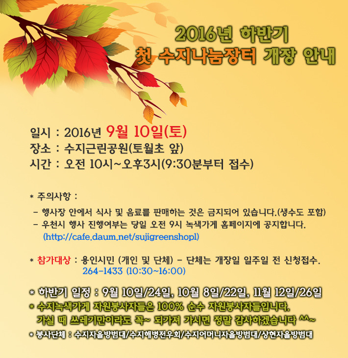 수지나눔장터 하반기 첫 개장안내 작성자miae|작성시간16.09.06|조회수139 목록 댓글 0 글자크기 작게가 글자크기 크게가 다음검색 현재 게시글 추가 기능 열기 북마크 공유하기 신고 센터로 신고 댓글 댓글 0 댓글쓰기 답글쓰기 댓글 리스트