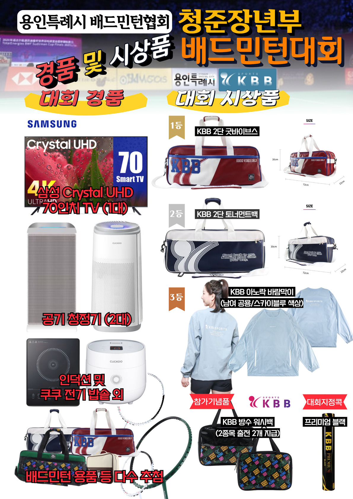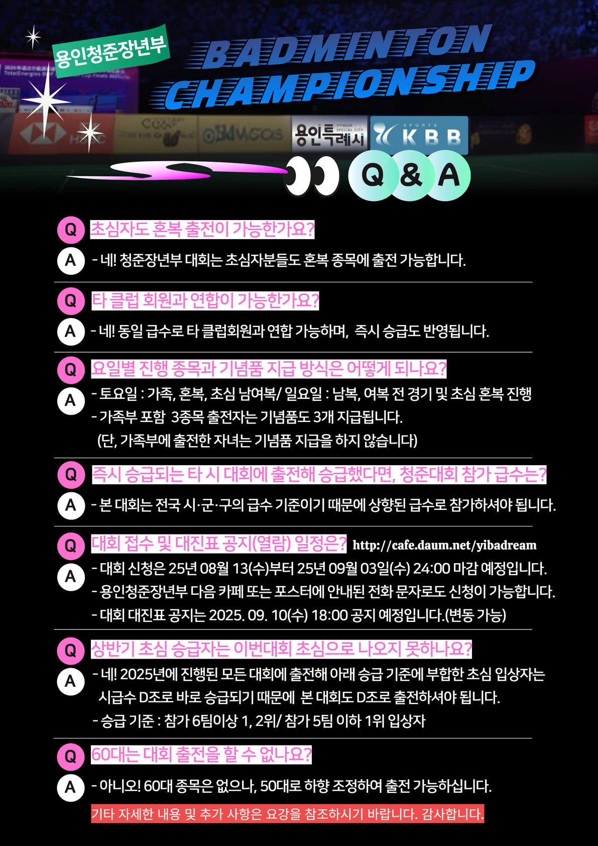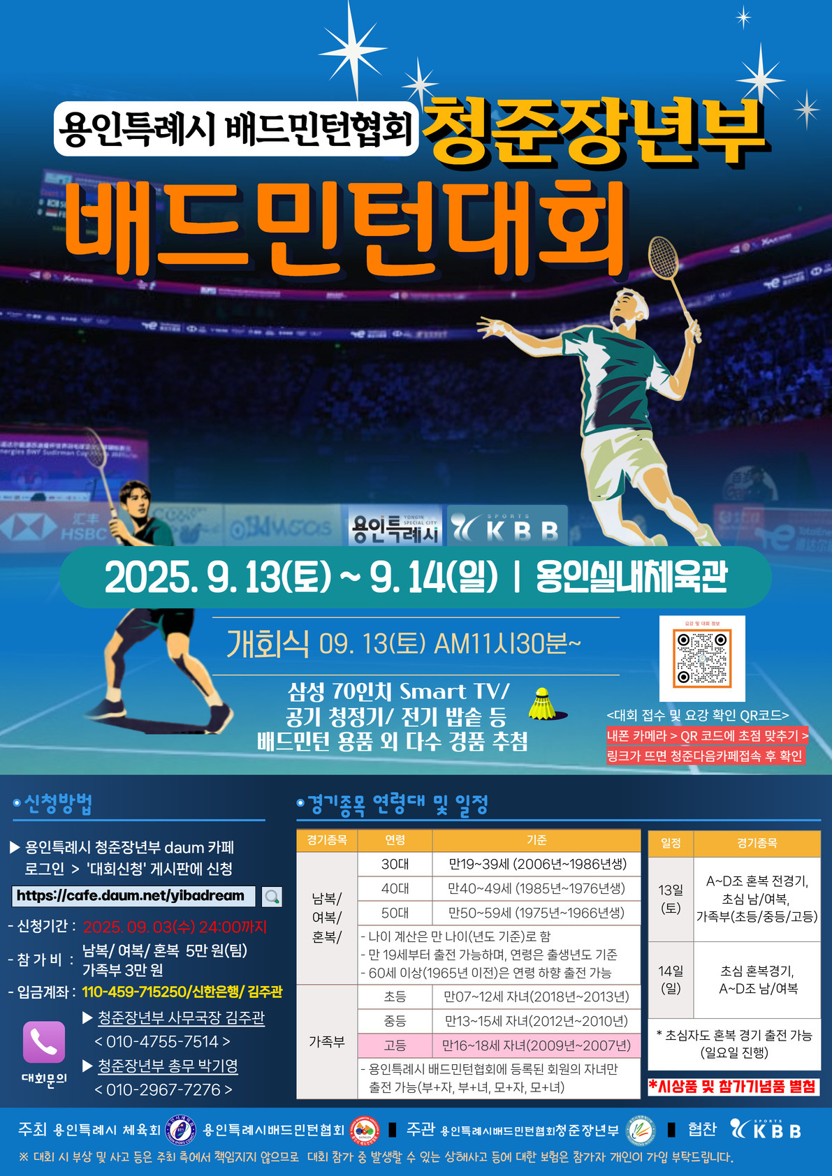 2025년 용인특례시 청준장년부 배드민턴대회 (9/13-14) 공지 작성자수민협/사무국장/박효인|작성시간25.08.13|조회수125 목록 댓글 0 글자크기 작게가 글자크기 크게가 대회 요강과 관련한 궁금한점은 청준장년부 운영진에게 문의 하시기 바랍니다.사무국장 김주관 010-4755-7514총무 박기영 010-2967-7276 2025년 용인특례시 청준장년부대회 요강 최종본.pdf183.97KB 첨부파일첨부된 파일이 4개 있습니다. etc 파일 2025청준대회 포스터.jfif 다운로드 etc 파일 2025청준대회 QnA.jfif 다운로드 etc 파일 2025청준대회 시상품.jfif 다운로드 pdf 파일 2025년 용인특례시 청준장년부대회 요강 최종본.pdf 다운로드 다음검색 현재 게시글 추가 기능 열기 북마크 신고 센터로 신고 댓글 댓글 0 댓글쓰기 답글쓰기 댓글 리스트