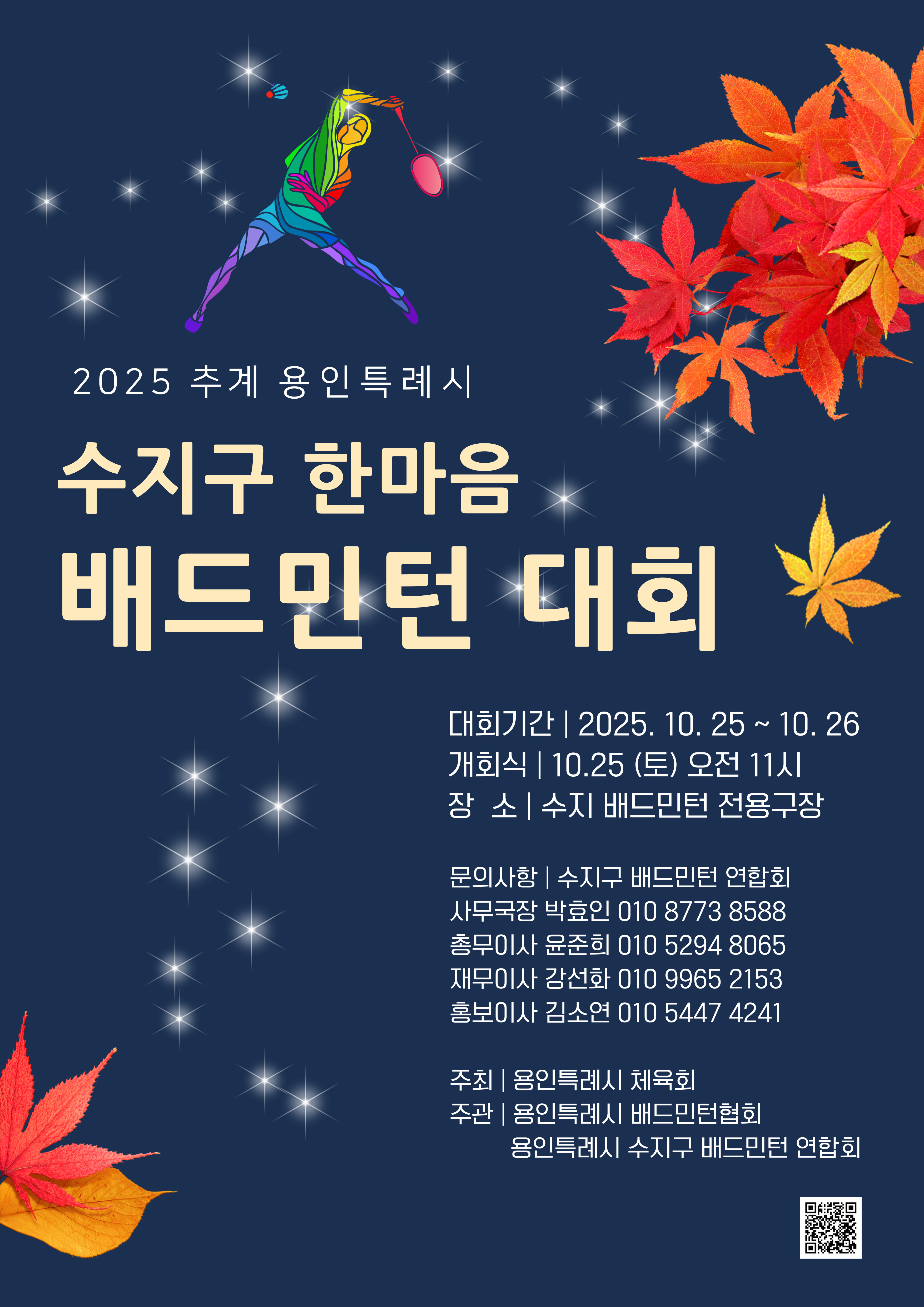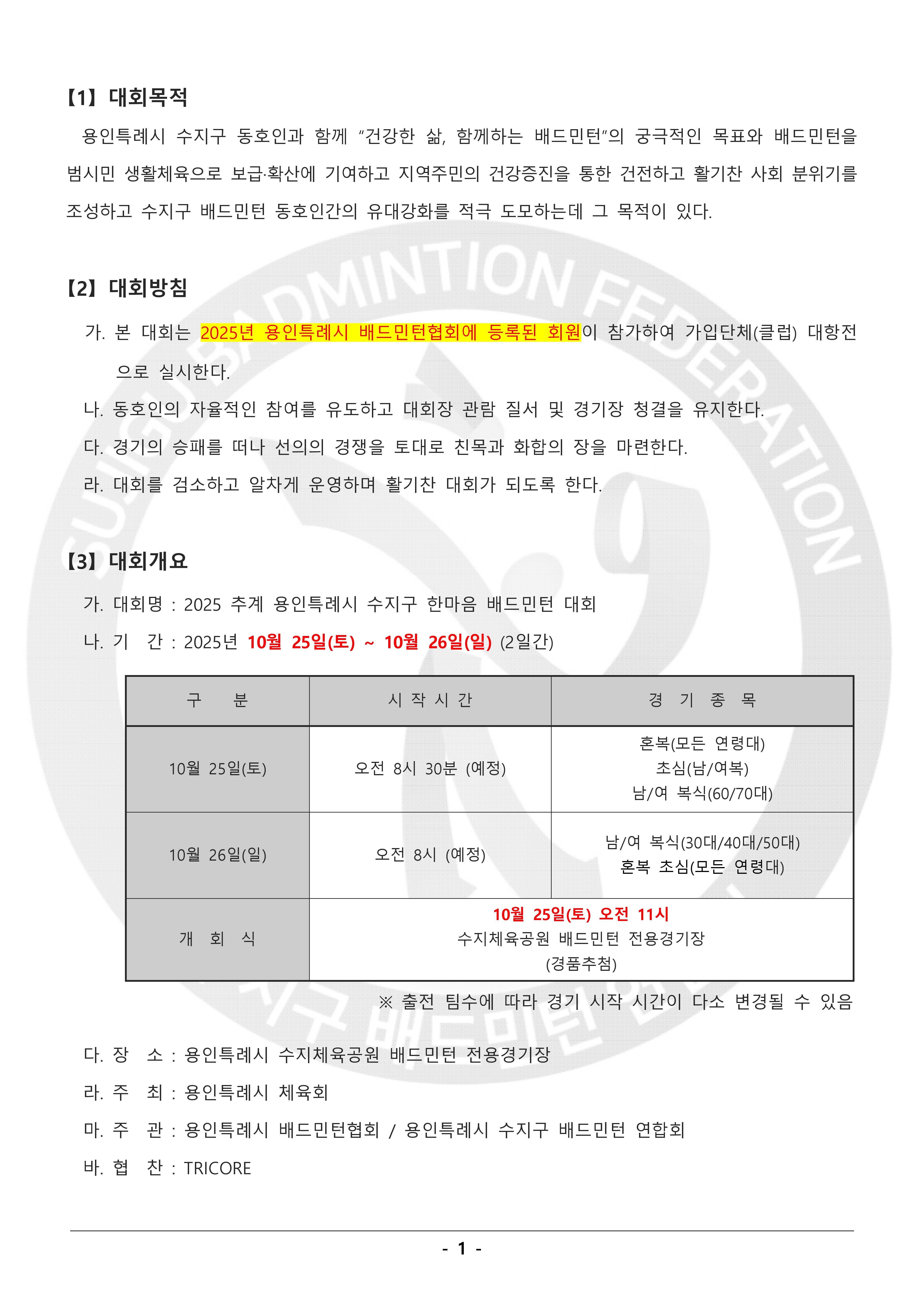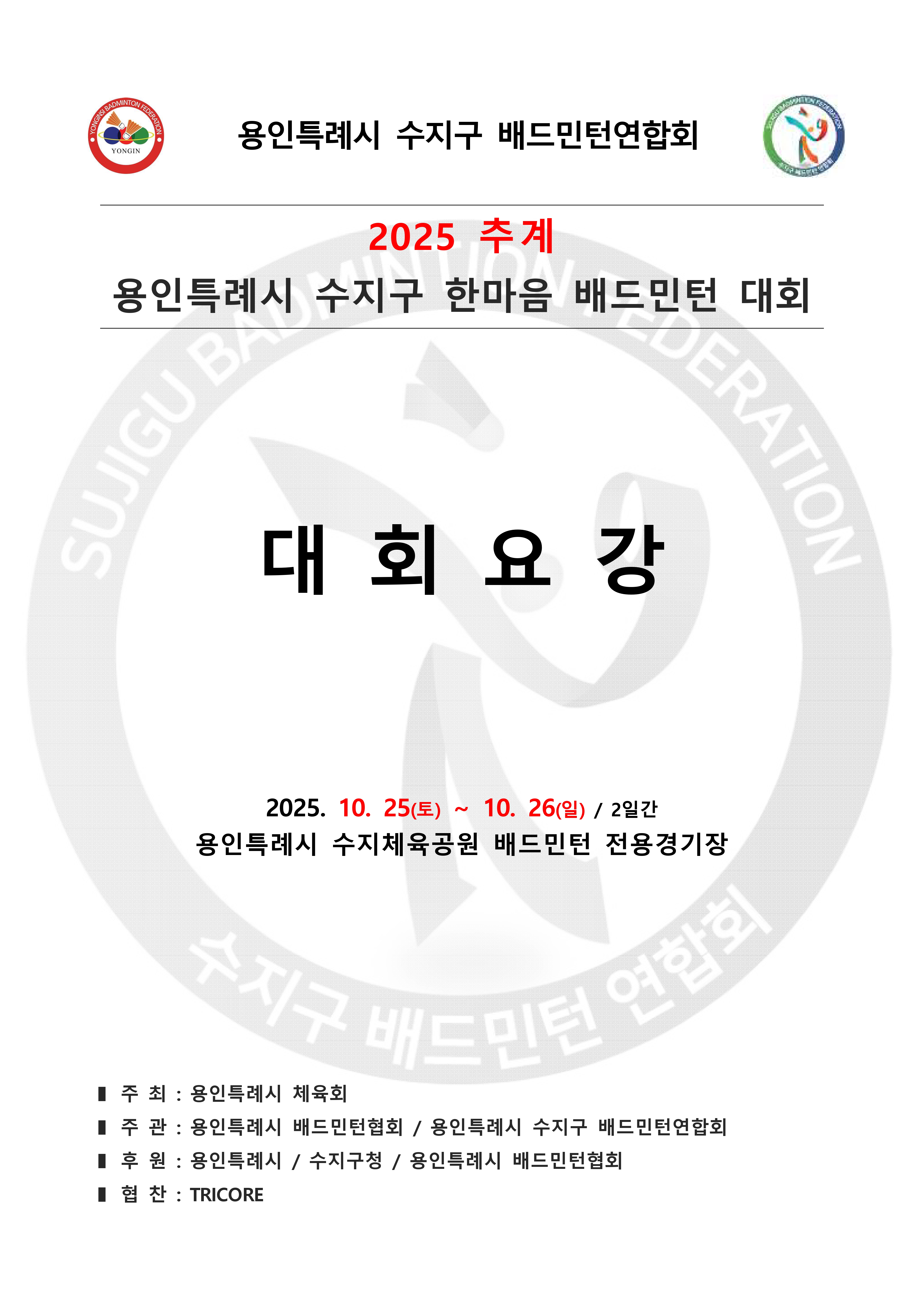 2025 추계 용인특례시 수지구 한마음 배드민턴대회 알림 (대회 요강) 작성자수민협/사무국장/박효인|작성시간25.09.15|조회수499 목록 댓글 0 글자크기 작게가 글자크기 크게가 본 연합회는 『2025 추계 용인특례시 수지구 한마음 배드민턴 대회』를 아래와 같이 개최하고자 하오니,동호인 여러분의 많은 참여 부탁드립니다. 2025년 추계 용인특례시 수지구 한마음배드민턴 대회 요강.pdf1.75MB 첨부파일첨부된 파일이 11개 있습니다. jpg 파일 2025년 추계 용인특례시 수지구 한마음배드민턴 대회 요강-1.jpg 다운로드 jpg 파일 2025년 추계 용인특례시 수지구 한마음배드민턴 대회 요강-2.jpg 다운로드 jpg 파일 2025년 추계 용인특례시 수지구 한마음배드민턴 대회 요강-3.jpg 다운로드 jpg 파일 2025년 추계 용인특례시 수지구 한마음배드민턴 대회 요강-4.jpg 다운로드 jpg 파일 2025년 추계 용인특례시 수지구 한마음배드민턴 대회 요강-5.jpg 다운로드 jpg 파일 2025년 추계 용인특례시 수지구 한마음배드민턴 대회 요강-6.jpg 다운로드 jpg 파일 2025년 추계 용인특례시 수지구 한마음배드민턴 대회 요강-7.jpg 다운로드 jpg 파일 2025년 추계 용인특례시 수지구 한마음배드민턴 대회 요강-8.jpg 다운로드 pdf 파일 2025년 추계 용인특례시 수지구 한마음배드민턴 대회 요강.pdf 다운로드 jpg 파일 2025추계-포스터02.jpg 다운로드 jpg 파일 2025추계-포스터01.jpg 다운로드 다음검색 현재 게시글 추가 기능 열기 북마크 신고 센터로 신고 댓글 댓글 0 댓글쓰기 답글쓰기 댓글 리스트