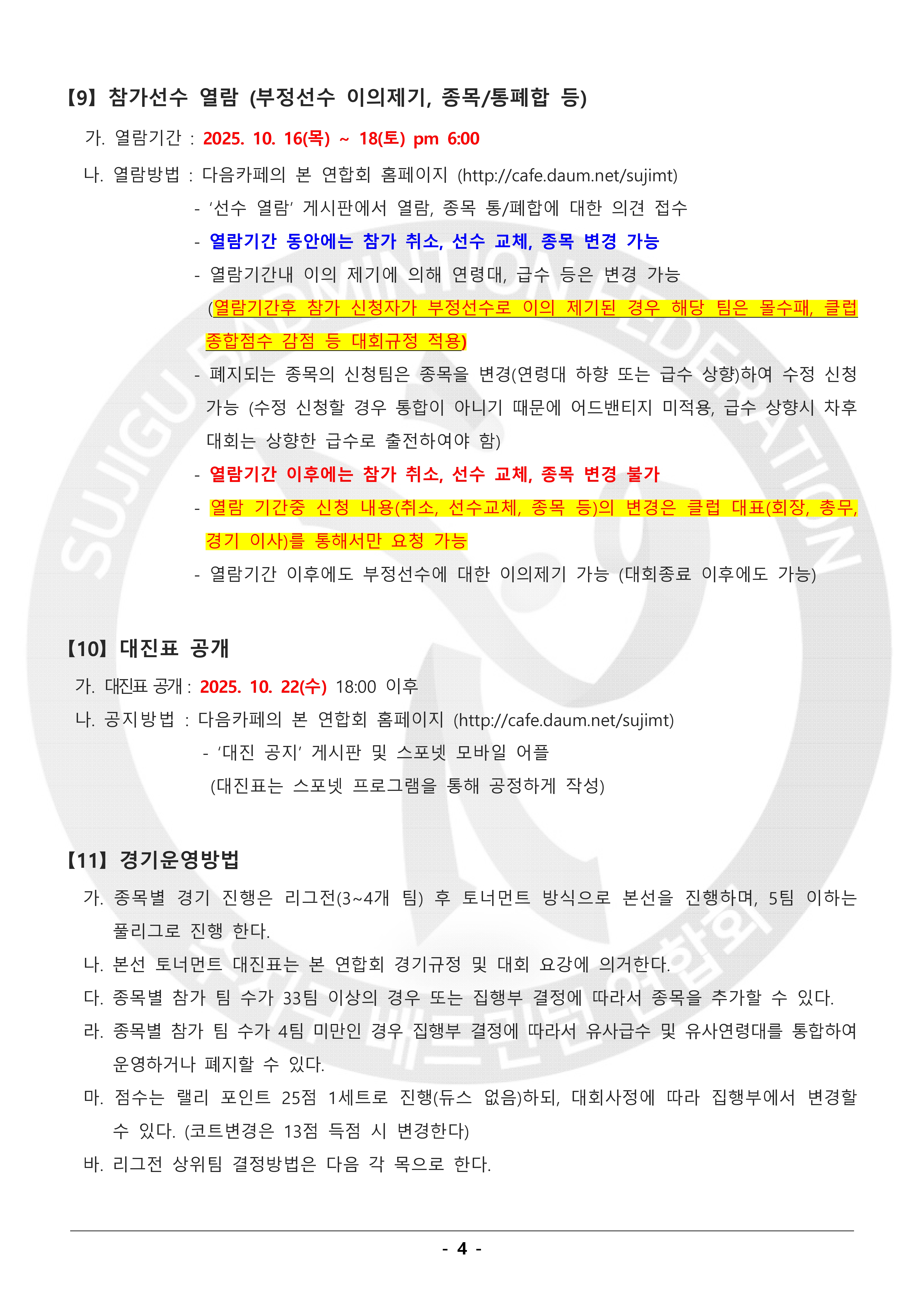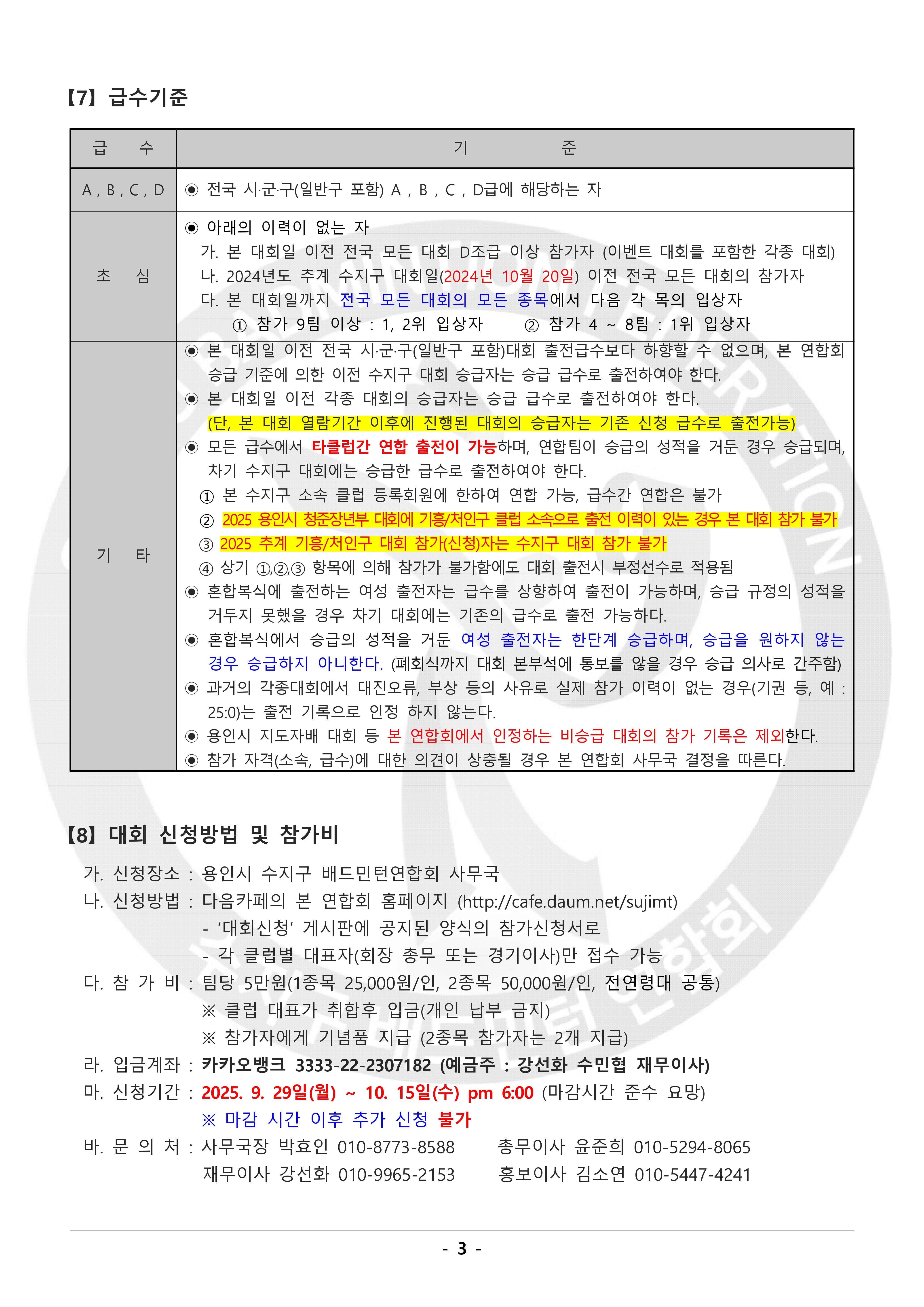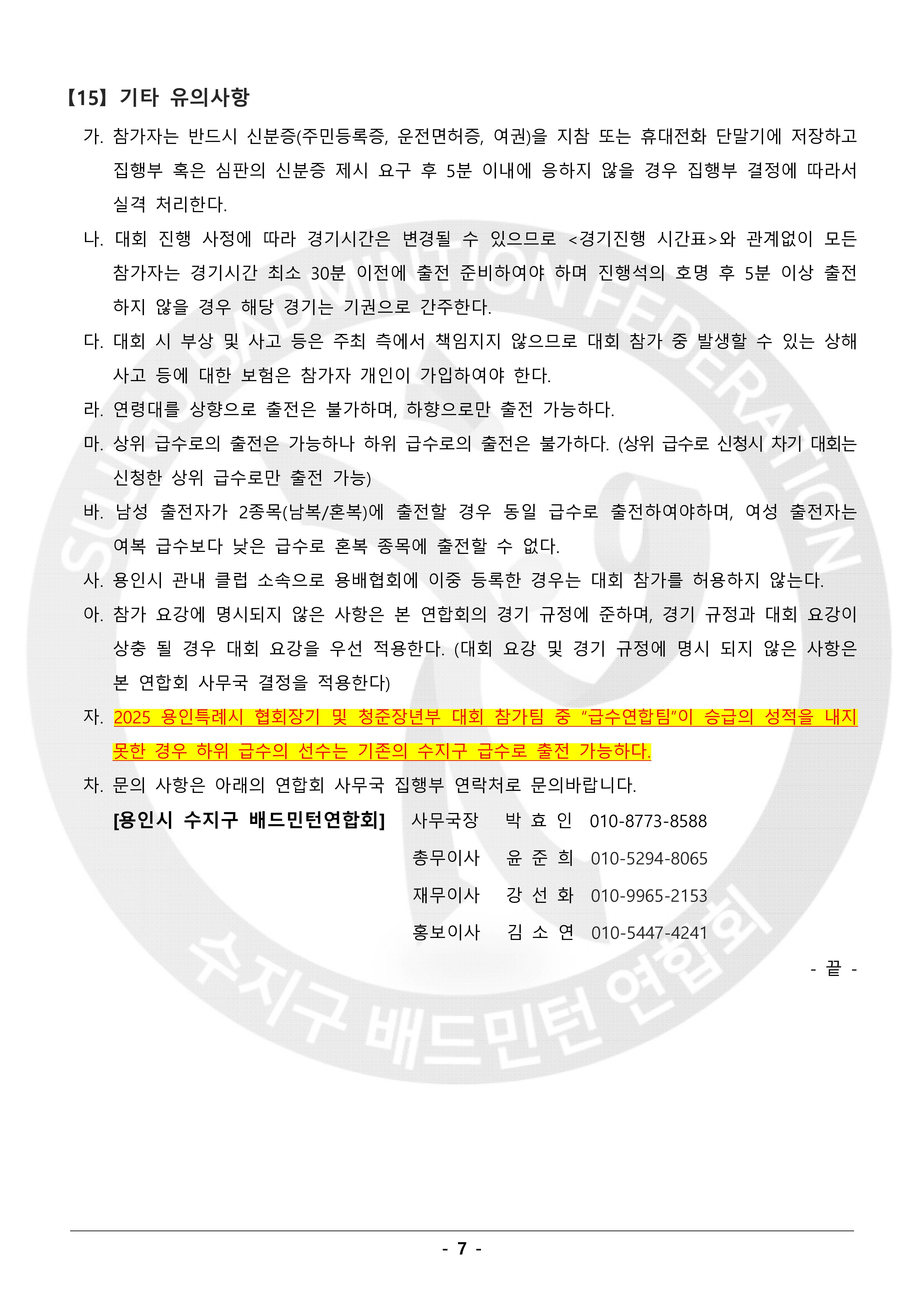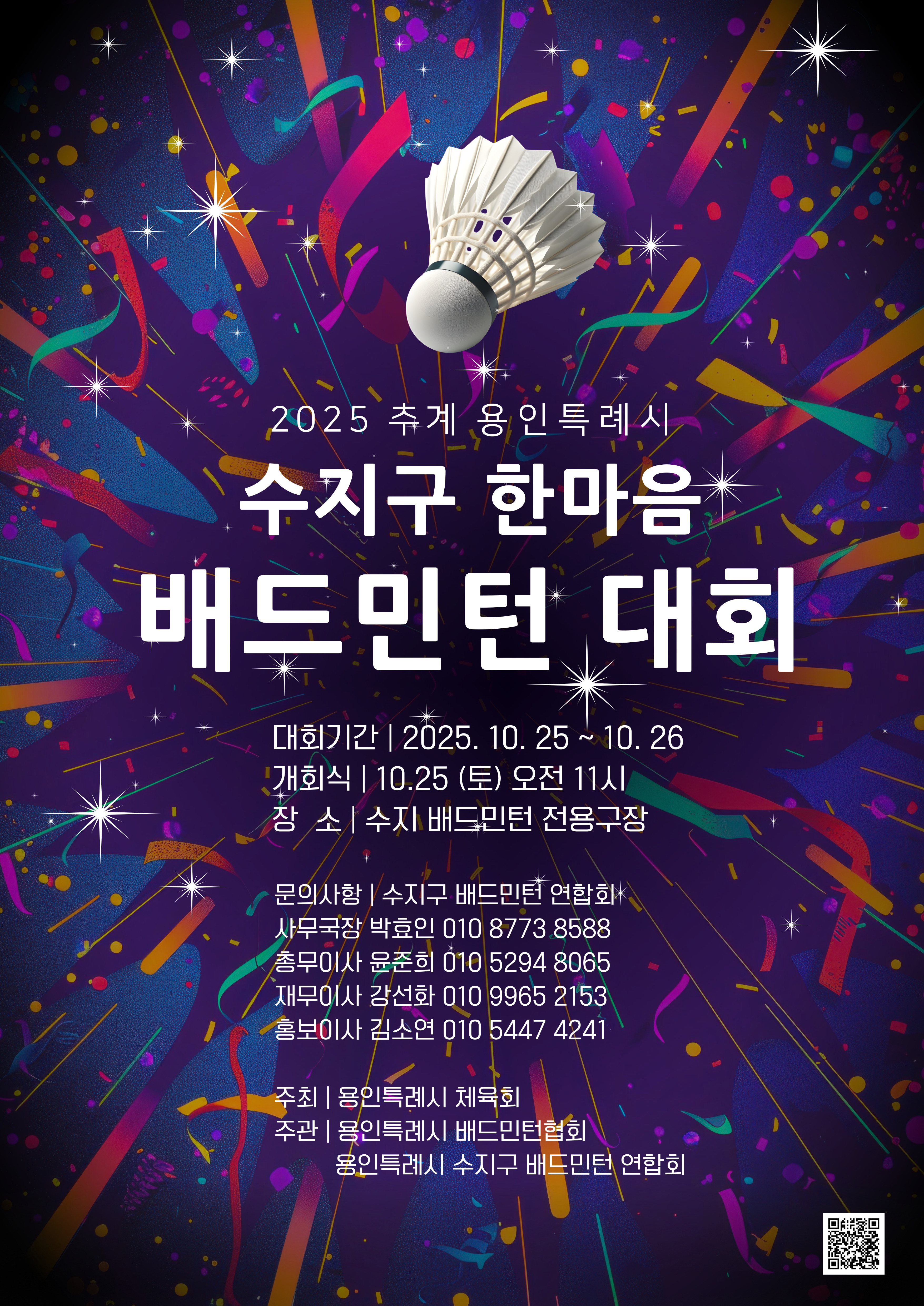2025 추계 용인특례시 수지구 한마음 배드민턴대회 알림 (대회 요강) 작성자수민협/사무국장/박효인|작성시간25.09.15|조회수499 목록 댓글 0 글자크기 작게가 글자크기 크게가 본 연합회는 『2025 추계 용인특례시 수지구 한마음 배드민턴 대회』를 아래와 같이 개최하고자 하오니,동호인 여러분의 많은 참여 부탁드립니다. 2025년 추계 용인특례시 수지구 한마음배드민턴 대회 요강.pdf1.75MB 첨부파일첨부된 파일이 11개 있습니다. jpg 파일 2025년 추계 용인특례시 수지구 한마음배드민턴 대회 요강-1.jpg 다운로드 jpg 파일 2025년 추계 용인특례시 수지구 한마음배드민턴 대회 요강-2.jpg 다운로드 jpg 파일 2025년 추계 용인특례시 수지구 한마음배드민턴 대회 요강-3.jpg 다운로드 jpg 파일 2025년 추계 용인특례시 수지구 한마음배드민턴 대회 요강-4.jpg 다운로드 jpg 파일 2025년 추계 용인특례시 수지구 한마음배드민턴 대회 요강-5.jpg 다운로드 jpg 파일 2025년 추계 용인특례시 수지구 한마음배드민턴 대회 요강-6.jpg 다운로드 jpg 파일 2025년 추계 용인특례시 수지구 한마음배드민턴 대회 요강-7.jpg 다운로드 jpg 파일 2025년 추계 용인특례시 수지구 한마음배드민턴 대회 요강-8.jpg 다운로드 pdf 파일 2025년 추계 용인특례시 수지구 한마음배드민턴 대회 요강.pdf 다운로드 jpg 파일 2025추계-포스터02.jpg 다운로드 jpg 파일 2025추계-포스터01.jpg 다운로드 다음검색 현재 게시글 추가 기능 열기 북마크 신고 센터로 신고 댓글 댓글 0 댓글쓰기 답글쓰기 댓글 리스트