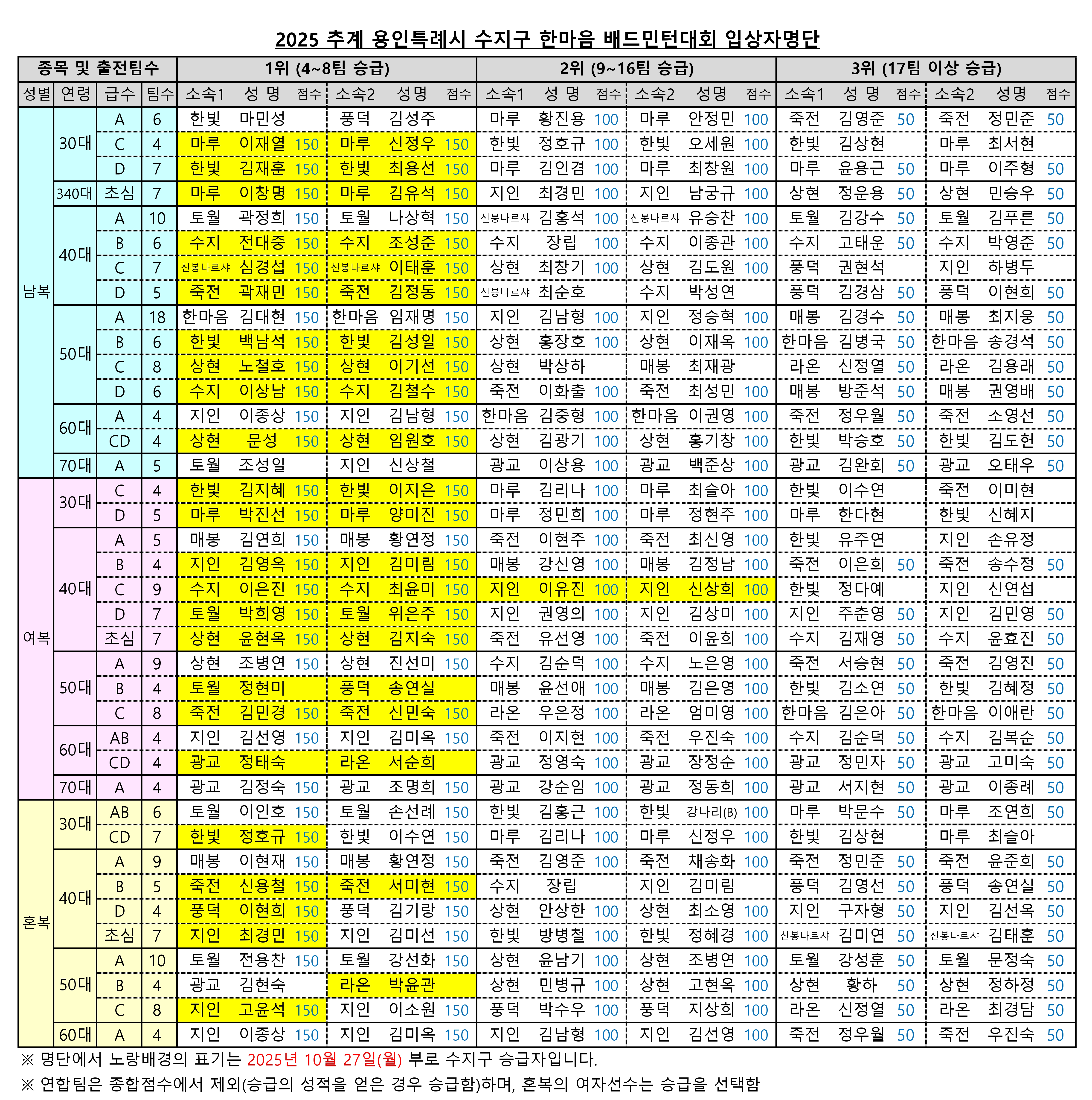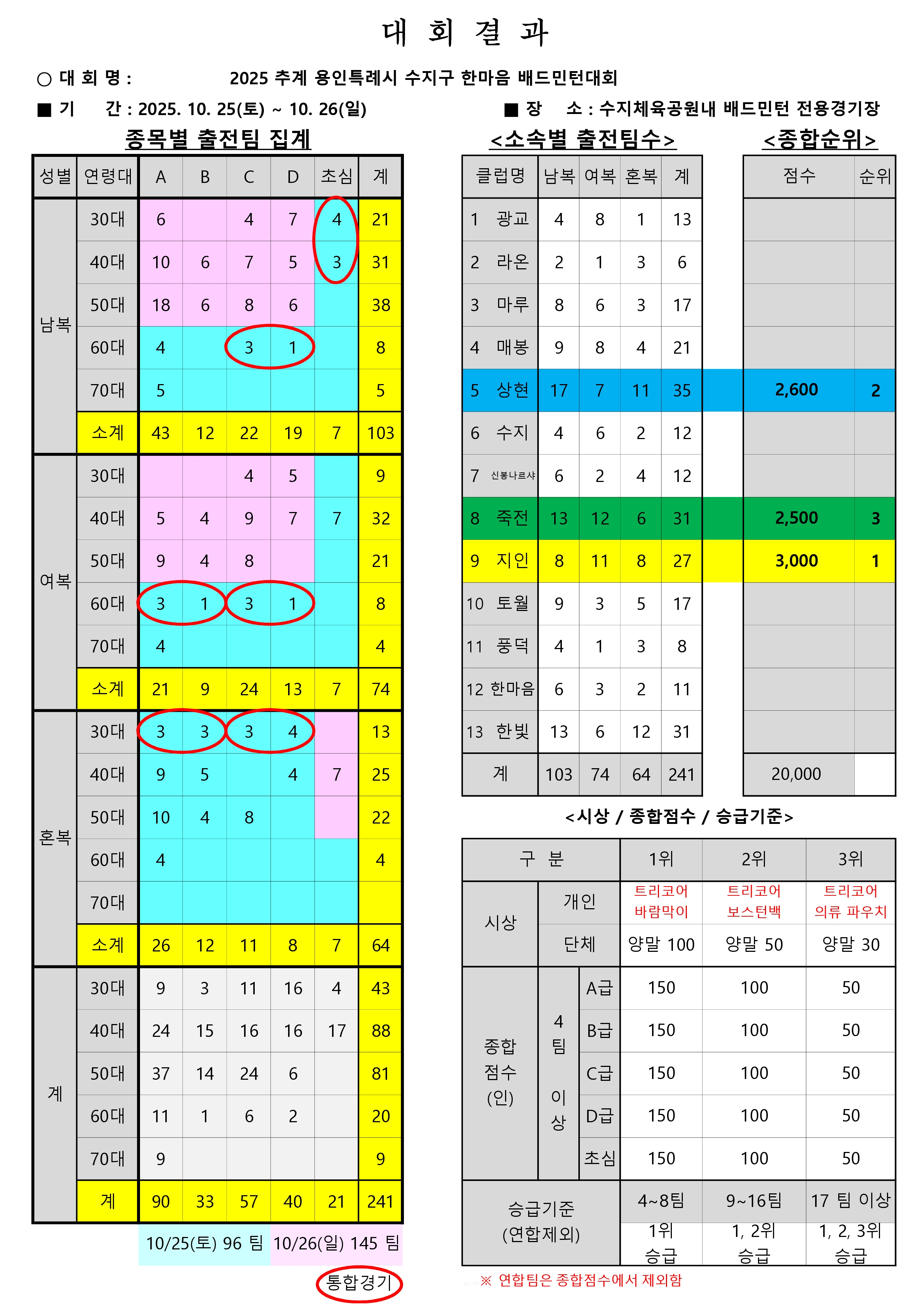 2025 추계 용인시 수지구 한마음 배드민턴대회 결과 작성자수민협/사무국장/박효인|작성시간25.10.27|조회수155 목록 댓글 0 글자크기 작게가 글자크기 크게가 성공적인 대회를 마칠수 있게 도움 주신 모든 동호인 여러분께 감사의 말씀 전합니다.수지구 배드민턴연합회 집행부 일동 다음검색 현재 게시글 추가 기능 열기 북마크 신고 센터로 신고 댓글 댓글 0 댓글쓰기 답글쓰기 댓글 리스트