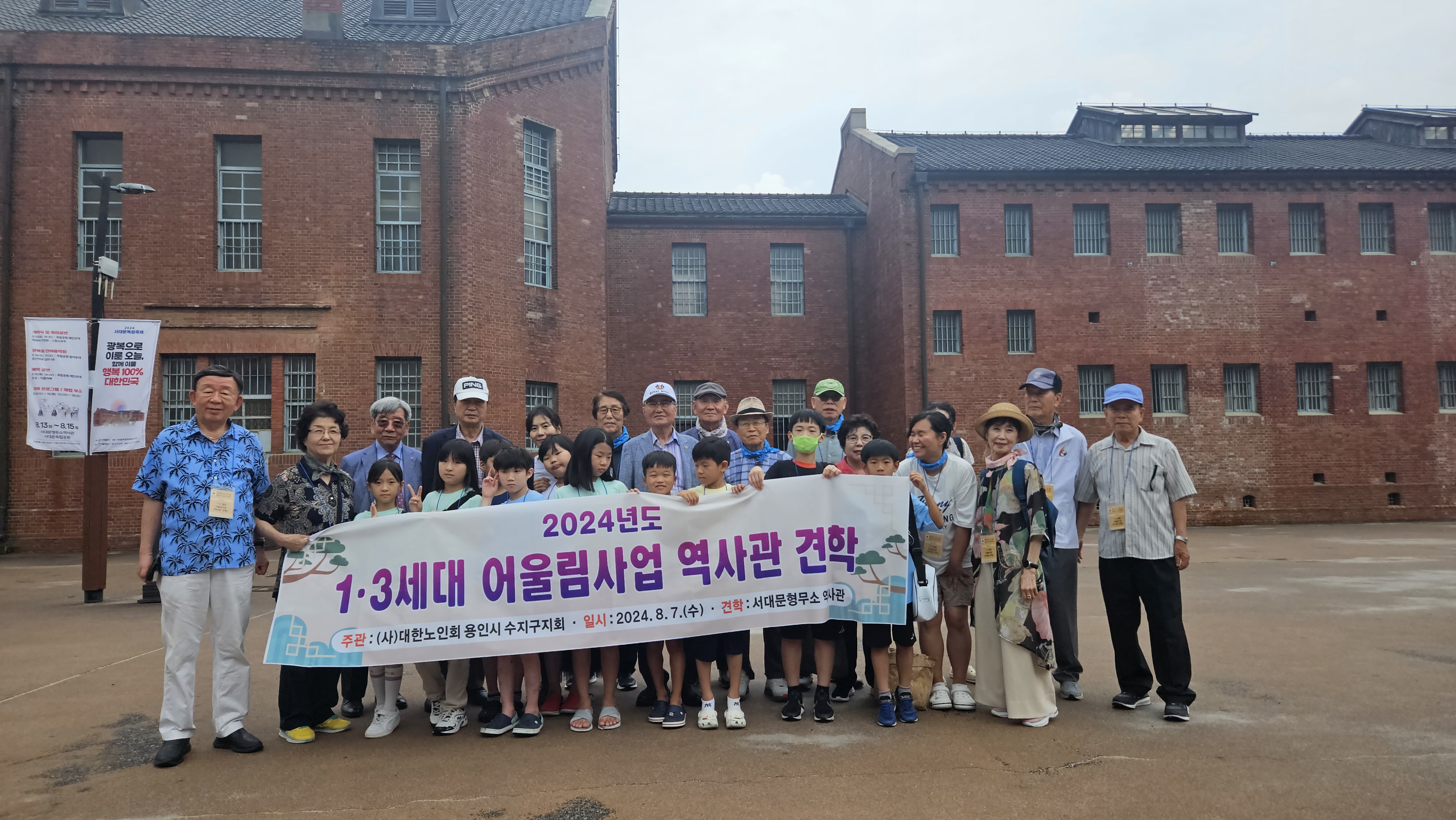 (사)대한노인회용인시 수지구지회(지회장:이재규)는 지난 8월 7일(수), 어린이와 어머니, 지회 임원진 등 34명은 역사교실 참여를 통해 지역사회에 참여하여 학생들은 어른들과 같이 배우고 과거 생활상을 둘러보며 역사의 인식 및 애향심을 고취하는 2024년도 1・3세대 어울림사업 행사로 서대문형무소 역사관 견학을 다녀왔다.