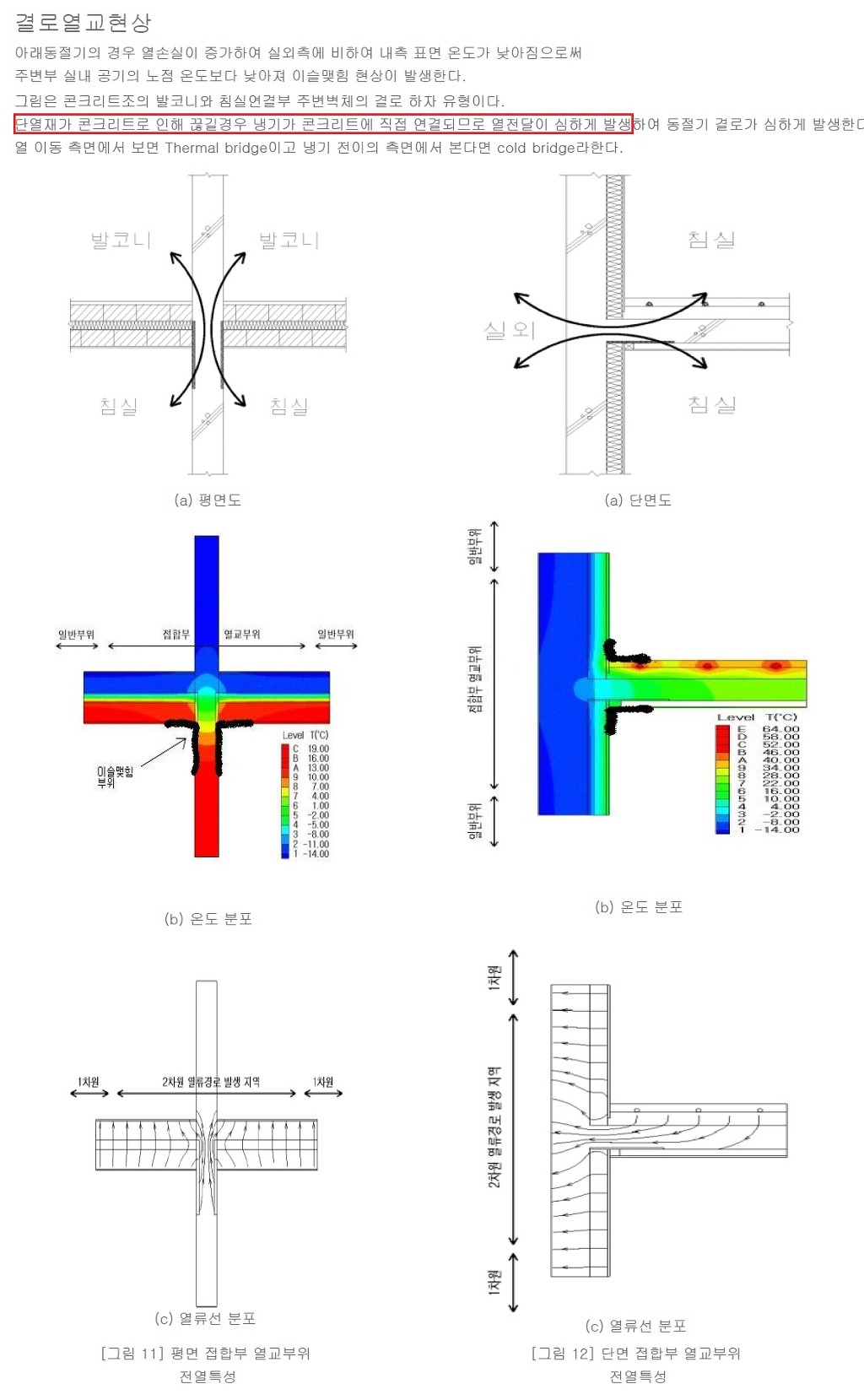 의 실내표면에 물방울이 발생한다. 표면결로 발생이 우려되는 곳은 벽체의 연결부위인 모서리 부분과 창의 상인방 등 단열이 어