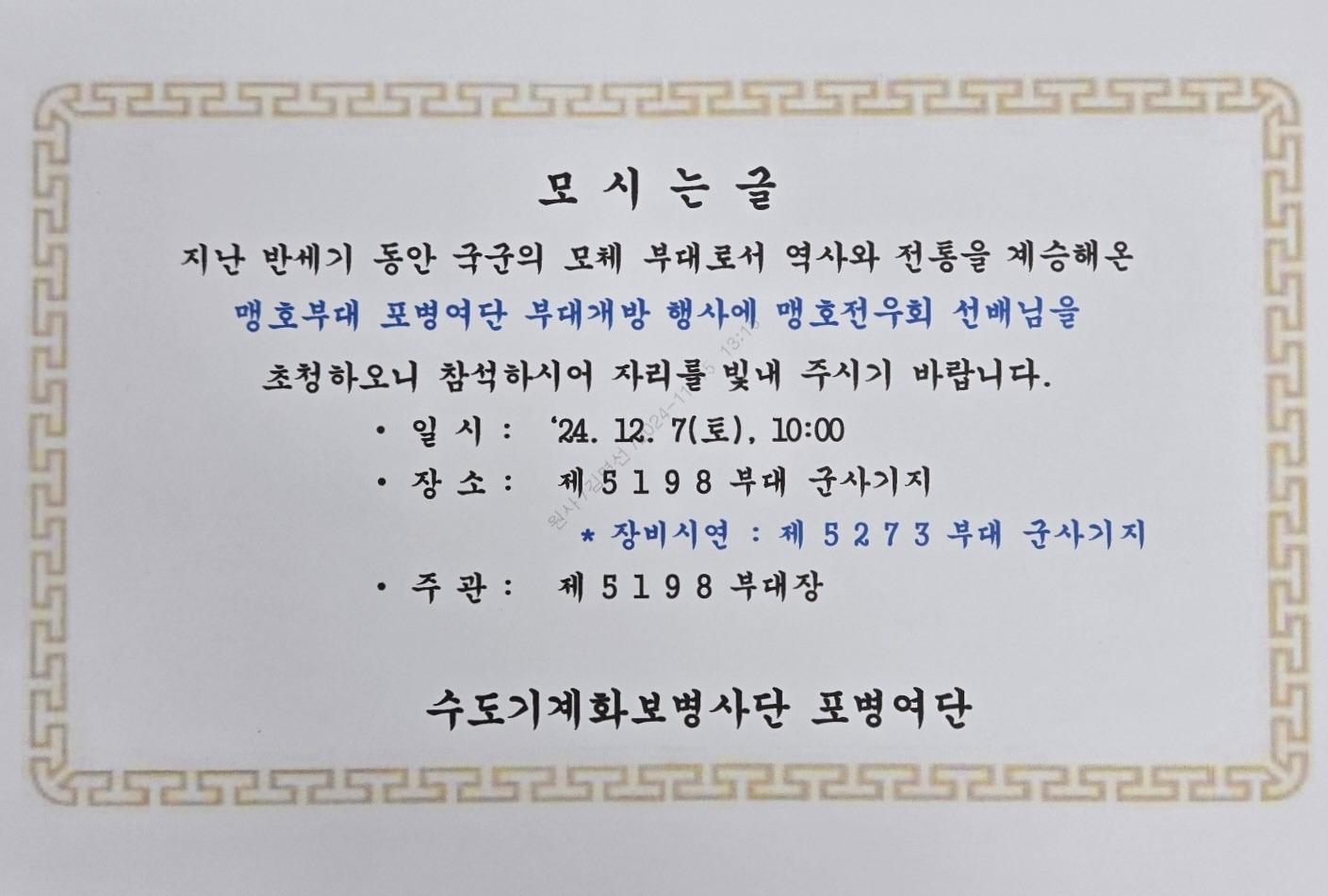 작성자백승준(포병88)서울지부장 작성시간 24.12.04 행사는 취소되었습니다 맹호!