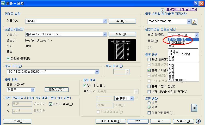 2. 만일 2004 버전이상이라면 음영 플롯에서 [숨김]에 놓지 말고 [표시되는 대로]또는 [와이어 프레임]에 놓으세요.