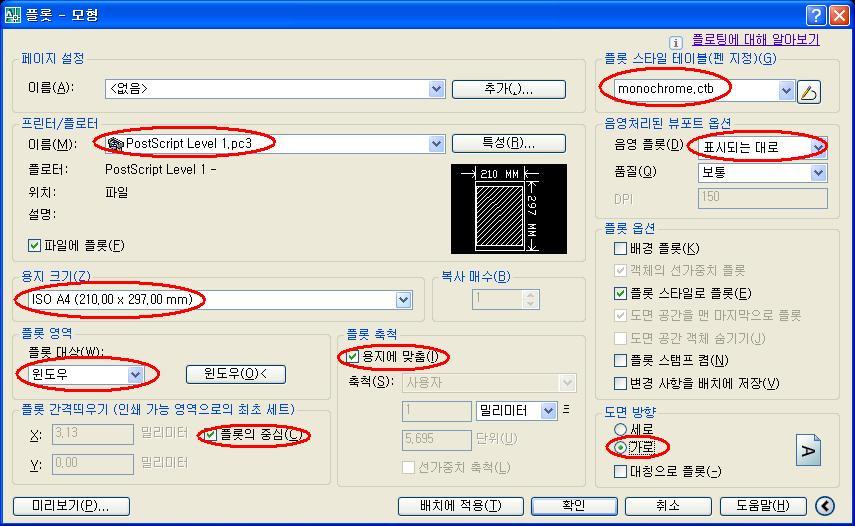- 프린터/플로터의 종류를 앞에서 만든 [PostScrip Level1.pcs]로 - 용지 크기를: A4로(적당 크기) - 플롯 영역: 여백을 빼고 [윈도우]에서 필요한 만큼 지정 - 플롯 스타일 테이블: 흑백으로 출력할 때는 Monochrome에 놓거나 만들어 씀 (레이어에서 선가중치를 정했으면 흑백은 Monochrome 칼라면 Acad.ctb/ 색상별로 굵기를 지정한다면 스스로 만든 플롯 스타일 사용)