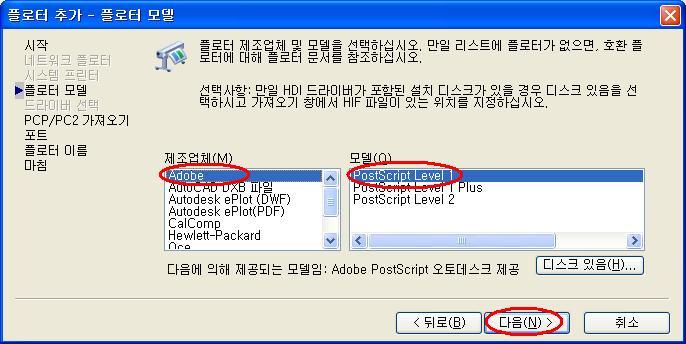 5. 플로터 모델을 [Adobe]의 [PostScript Level 1]을 선택(Level 2도 좋음)
