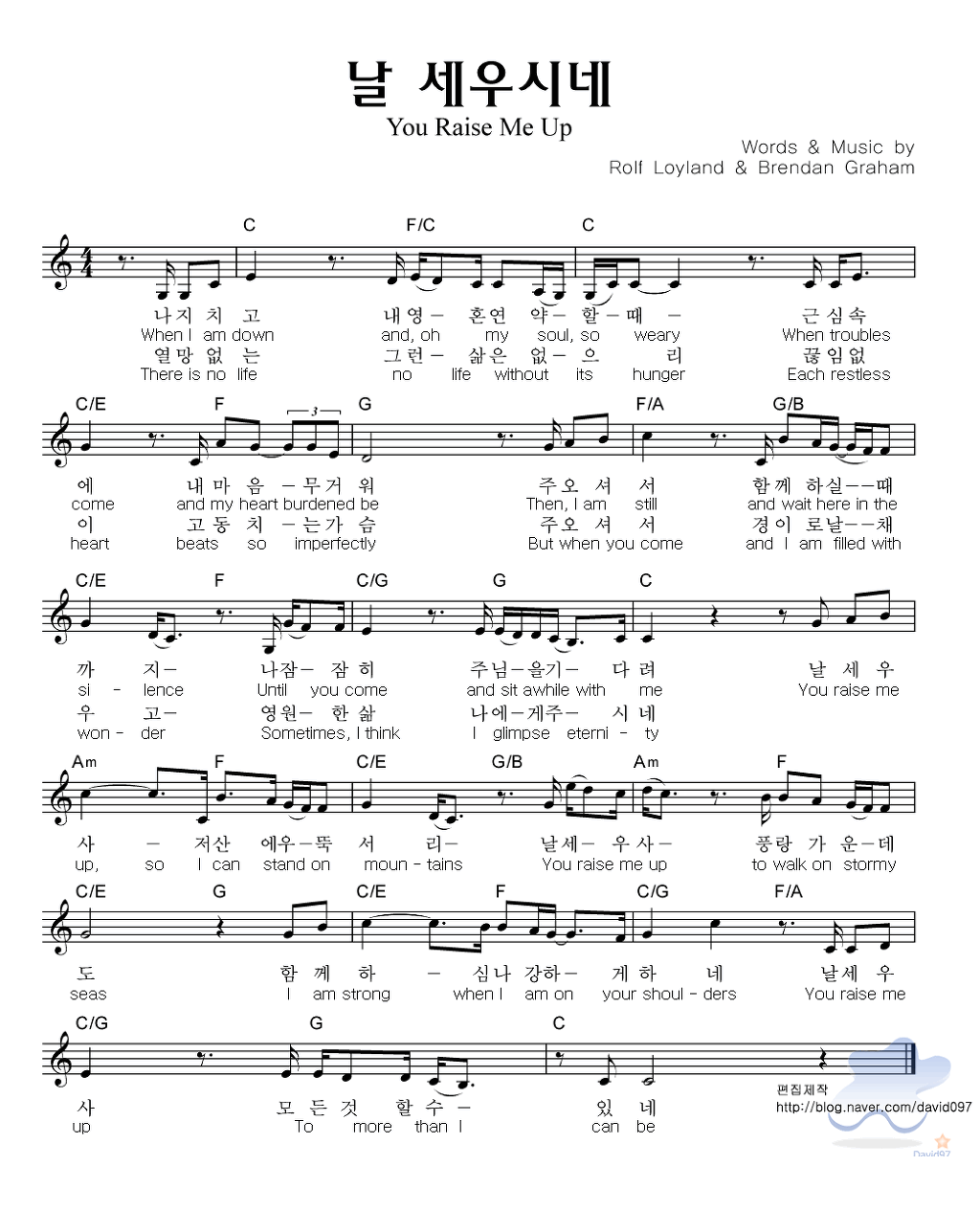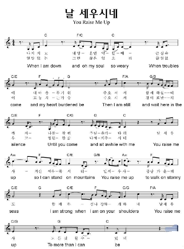 날세우시네(You raise me up) 한영 악보 작성자김용현|작성시간11.02.07|조회수2,456 목록 댓글 1 글자크기 작게가 글자크기 크게가 다음검색 현재 게시글 추가 기능 열기 북마크 공유하기 신고 센터로 신고 댓글 댓글 1 댓글쓰기 답글쓰기 댓글 리스트 작성자조영자 | 작성시간 11.11.20 날세우시는 하나님 감사해요~~ 댓글 전체보기