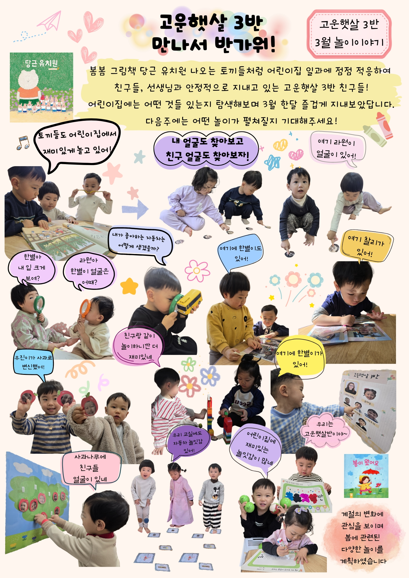 고운햇살 3반 3월 놀이이야기 작성자수리동어린이집|작성시간26.03.27|조회수19 목록 댓글 0 글자크기 작게가 글자크기 크게가 다음검색 현재 게시글 추가 기능 열기 북마크 공유하기 신고 센터로 신고 댓글 댓글 0 댓글쓰기 답글쓰기 댓글 리스트