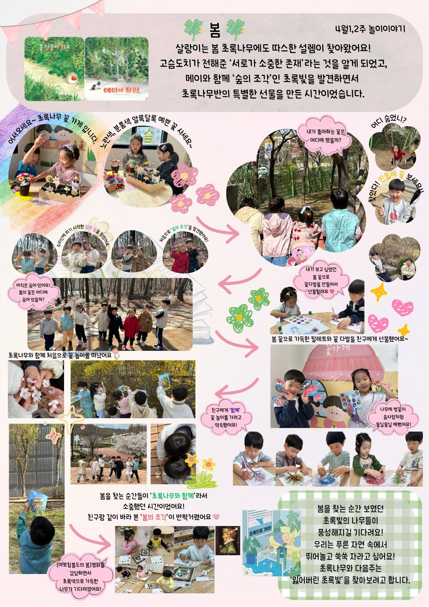 초록나무반 4월 1,2주 놀이이야기 작성자수리동어린이집|작성시간26.04.13|조회수5 목록 댓글 0 글자크기 작게가 글자크기 크게가 다음검색 현재 게시글 추가 기능 열기 북마크 공유하기 신고 센터로 신고 댓글 댓글 0 댓글쓰기 답글쓰기 댓글 리스트