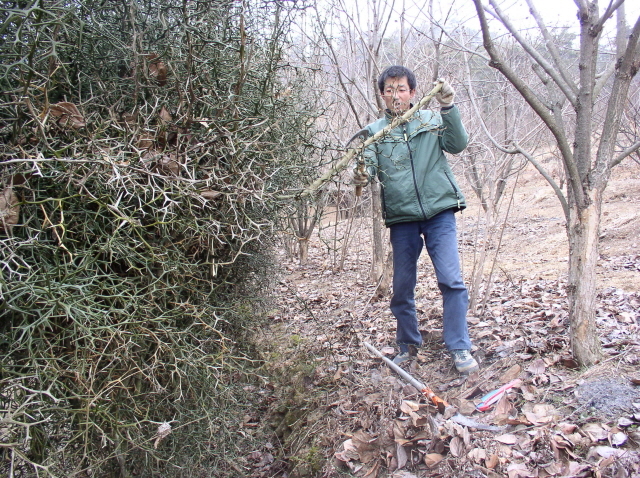 아랫마을에 탱자나무 울타리가 있는 집에 가서 도끼자루감을 몇 개 잘라왔어요.