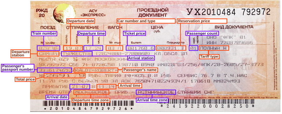 러시아 열차의 종이 티켓은 러시아어로만 발행되기 때문에 러시아어를 모르는 외국인 여행객은 어려움을 느낄 수 있다. 아래에 예시와 번역이 있다. (wikitravel.com에서도 이미지를 볼 수 있다.)