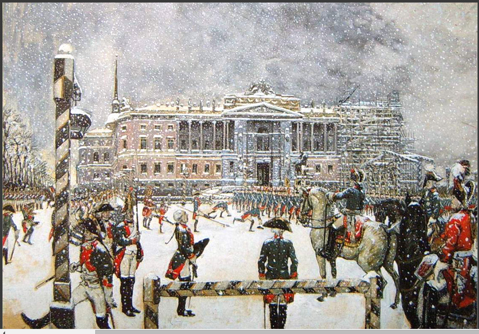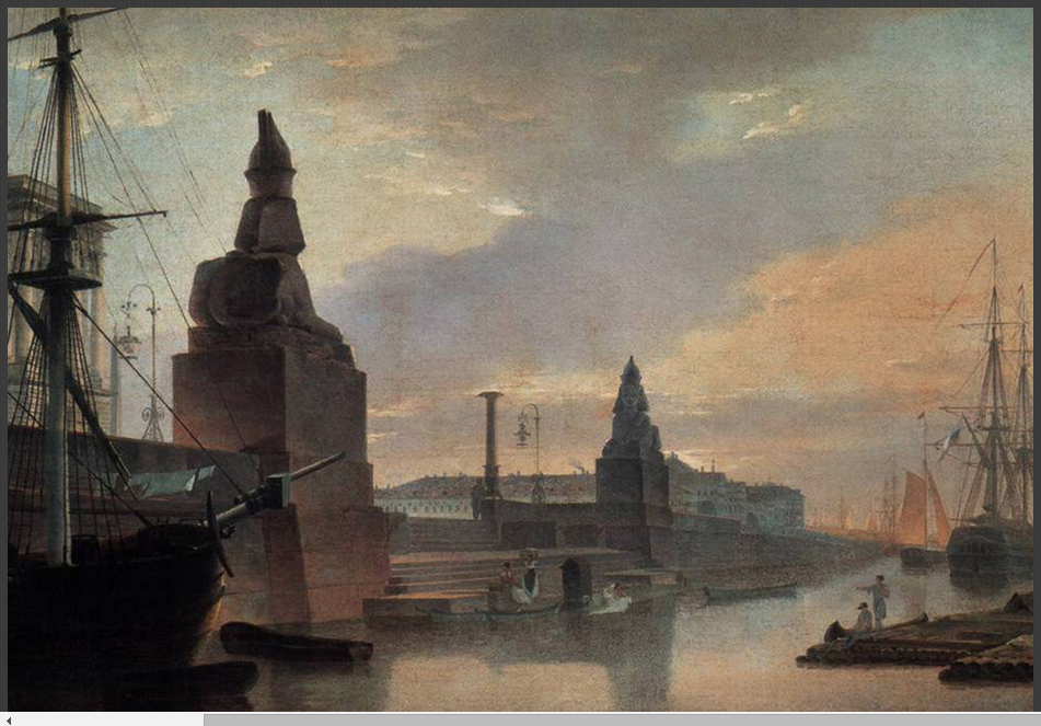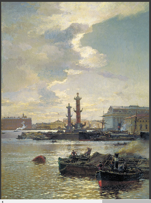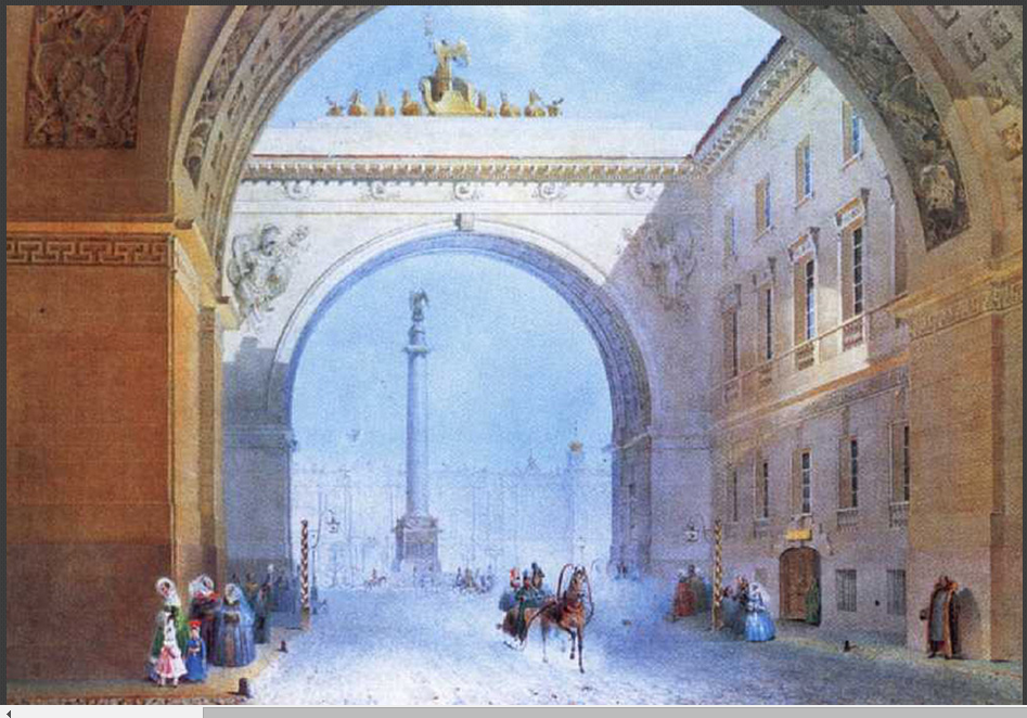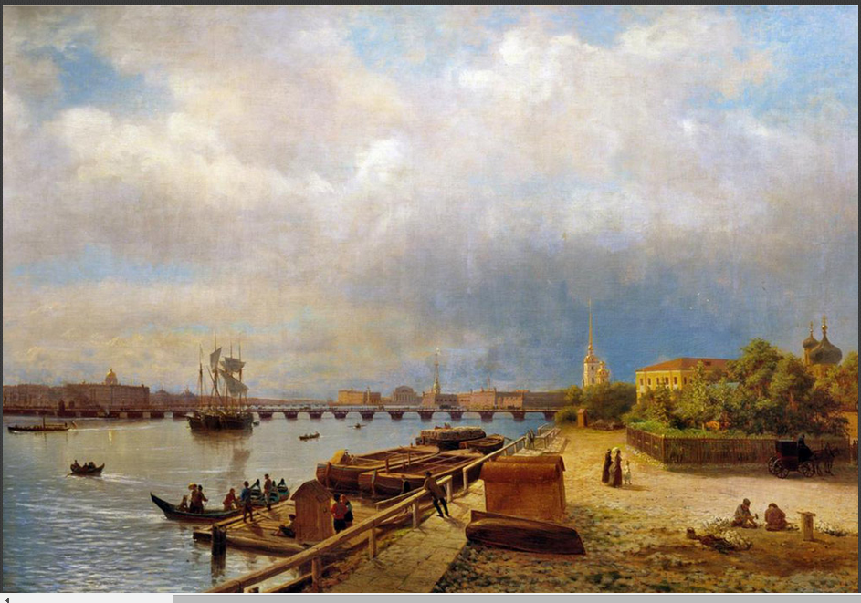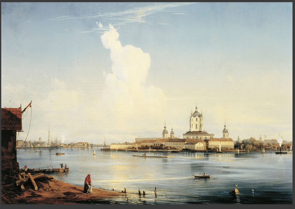 “상트페테르부르크는 러시아의 문화적 수도이다.” 페테르부르크 토박이들은 이렇게 자주 말하곤 한다. 모스크비치들이 이들의 말에 늘 동의하지는 않지만, 이곳의 1km당 박물관, 기념물, 역사적 건축물 수는 그야말로 기록적이다. ‘네바 강의 도시’(상트페테르부르크의 별명)에서는 위대한 시인과 작가, 화가, 학자들이 거주하며 창작에 몸담았다. 화폭에 담긴 ‘문화 수도’의 다양한 색채를 한데 모아 보았다. / 상트페테르부르크 원로원 광장의 표트르 대제 동상 모습. 1870년. 바실리 수리코프. 스몰리니 사원(Смольный собор) 전경. 1740년 옐리자베타 페트로브나 여제는 스몰리니 저택(Смольный дом) —여제가 유년 시절 내내 살았던 궁전— 자리에 수도원을 세우라고 지시했다. 수도원 건설 프로젝트는 이탈리아 태생의 러시아 건축가 바르톨로메오 라스트렐리가 맡았다. / 볼샤야 오흐타(Большая охта)에서 바라본 스몰리니 사원. 1852년. 알렉세이 보고류보프. 가로등이 러시아 최초로 등장한 곳이 바로 상트페테르부르크였다. 1706년 11월 23일 첫 가로등불이 커졌다. 이때부터 큰 축제가 있을 때마다 페테르부르크의 주요 거리 네 곳에서는 주택 전면에 등불을 내걸었다. / 상트페테르부르크의 조명. 표도르 바실리예프. 상트페테르부르크는 핀란드 만으로 흘러 나가는 네바 강 어귀의 늪지대에 건설되었다. 여러 출처에 따르면, 상트페테르부르크는 3백 년 역사에서 약 3백 번의 홍수를 기록했다. / 페테르부르크의 바지선. 1891년. 알렉산드르 베그로프. 알렉산드르 베누아는 상트페테르부르크의 표트르 대제 동상에 관한 알렉산드르 푸시킨의 장편 서사시 ‘청동기마상’을 위해 이 삽화를 그렸다. 삽화는 환상적인 공포감을 심어준다. 청동기마상이 깨어나 그의 적을 쫓고 있는 가운데 보름달은 기마상과 적이 달리고 있는 땅 위로 무시무시한 그림자를 길게 드리우고 있다. / 푸시킨의 장편 서사시 표지를 위한 청동기마상 디자인. 알렉산드르 베누아. 해군성 광장(Адмиралтейская площадь)에서 열린 마슬레니차(러시아 전통 봄 맞이 축제) 기간의 민중 축제. 광장은 1822에서 1874년까지 존재했는데, 도시 축제는 모두 여기서 열렸다. 페테르부르크를 세운 표트르 대제 탄생 200주년을 맞아 광장 녹화 결정이 내려지면서 공원이 등장했고 광장은 해군성 대로로 바뀌었다. / 상트페테르부르크 해군성 광장의 공진회 부스들. 1869년. 콘스탄틴 마콥스키. 미하일롭스키 성(Михайловский замок) 앞에서 열린 황제 파벨 1세의 군사행진. 1907년. 파벨 1세는 1796년에 제위를 계승했다. 당대 사람들의 견해에 따르면, 파벨 1세는 폭군적 성향을 갖고 있었으며 연병 훈련과 병영에 병적으로 집착했다고 한다. 그는 누구라도 황제에게 무엇이든 청원할 수 있다고 공표했다. 그럼에도 불구하고 많은 청원자들이 황제의 명령으로 체형과 시베리아 유형에 처해졌다. / 알렉산드르 베누아. 상트페테르부르크의 마슬레니차. 마슬레니차 (참회절로도 알려져 있음) 전통은 러시아 민중이 겨울을 보내고 봄을 맞이하던 이교 시절로 거슬러 올라간다. / 화가 겸 무대장치가 알렉산드르 베누아 作. 150년 전 페테르부르크의 안마당들은 다른 도시들의 안마당들과 달랐고 지금도 차이를 보인다. 18세기 후반부터 상트페테르부르크에는 이웃한 건물들 사이에 골목을 두지 않고 서로 벽이 맞붙도록 짓는 건축 양식이 유행했다. 그때문에 건물과 건물 사이에 골목이 없이 건물 전면부들로만 길게 이어진 거대한 구역들이 생겨나기 시작했다. 이러한 구역들의 뒷편으로는 복잡한 아치와 통로들로 이어진 기묘한 안마당들이 조성되었다. / 1850년. 콘스탄틴 마콥스키. 러시아예술아카데미(Российкая Академия художеств)는 1724년 표트르 대제에 의해 설립되었고, 현재 학생들에게 역사적으로 중요한 시설과 유적들을 복구하는 기술만 아니라 다른 도시들의 프로젝트에 참여하는 방법도 교육하고 있다. 모스크바의 ‘구원자 예수 성당’ 재건 사업이 단적인 예이다. / 상트페테르부르크 예술아카데미 앞 선창에 마주서 있는 스핑크스 동상들. 1835년. 막심 보로비예프. 스트로가노프 다차(Строгановская дача)는 상트페테르부르크에 있는 파벨 스토로가노프 남작-백작(페테르부르크의 많은 부유한 상인과 지주가 이 가문 태생이었다) 소유의 영지이다. 이 다차에서 볼샤야 넵카(Большая Невка) 강 쪽으로 사자상과 켄타우로스(반인반마)상들로 장식된 화강암 계단이 나 있다. 다차의 2층은 나무로 지었는데, 중심부에는 무도회와 회합을 위해 강변과 나란하게 지은 홀이 자리 잡고 있었다. / 페테르부르크의 스트로가노프 다차 전경. 안드레이 보로힌. 1797년. 러시아 제국 군대의 총참모부는 옛 겨울궁전(Зимний Дворец)과 이웃해 있는 상트페테르부르크 궁전광장(Дворцовая площадь)의 한 건물 안에 자리 잡고 있었다. 총참모부의 두 날개 건물은 아치로 연결되어 있는데, 아치 위에는 여섯 마리의 말이 끄는 날아오를 듯한 전차 조형물이 설치되어 있다. / 총참모부 건물의 아치. 바실리 사도브니코프. 페