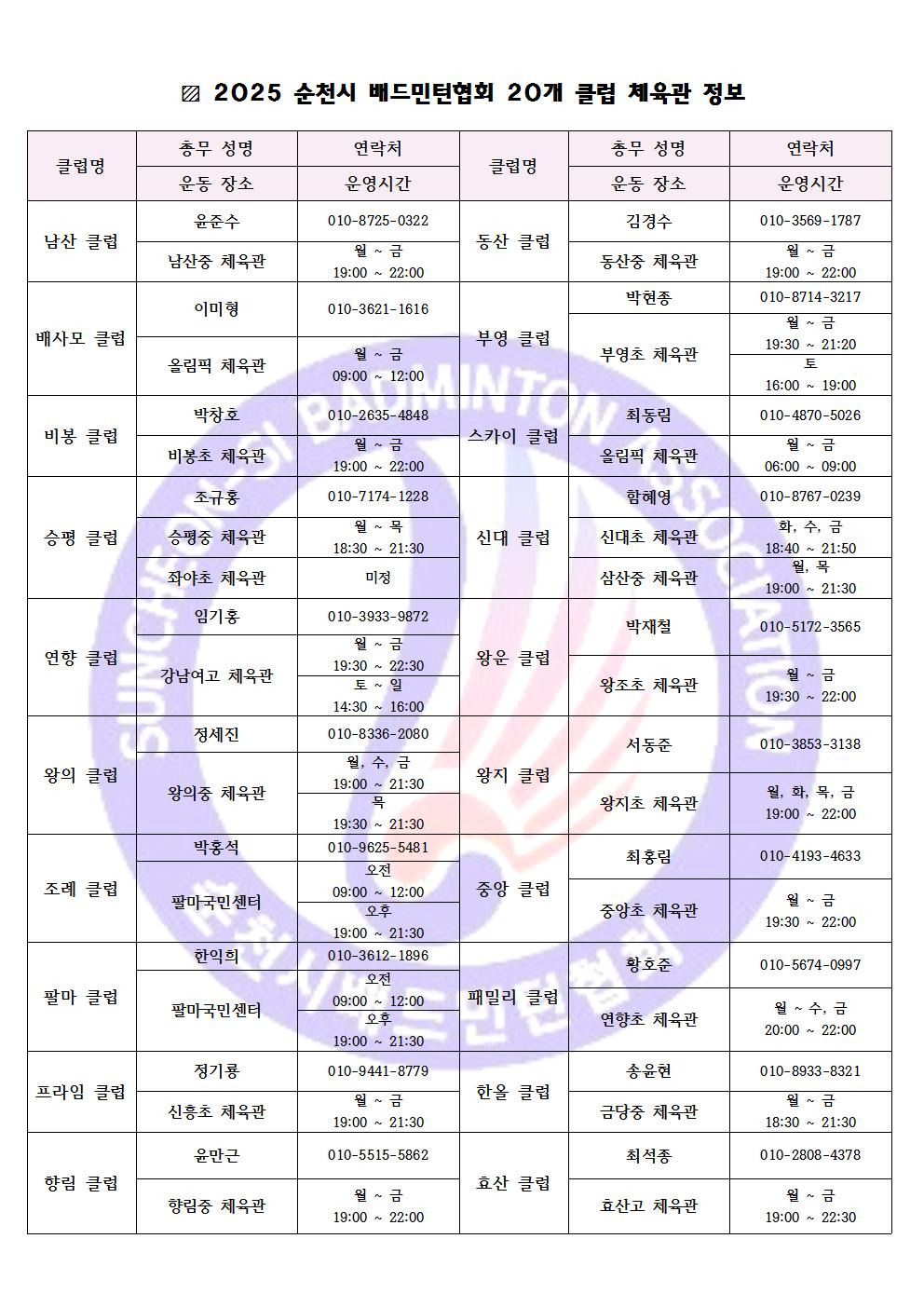 2025 순천시 배드민턴협회 20개 클럽 체육관 현황 작성자박성현/신대/홍보팀장|작성시간25.01.21|조회수695 목록 댓글 0 글자크기 작게가 글자크기 크게가 다음검색 현재 게시글 추가 기능 열기 북마크 공유하기 신고 센터로 신고 댓글 댓글 0 댓글쓰기 답글쓰기 댓글 리스트