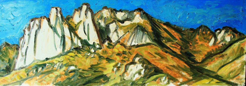 포천공장을 오가며 매번 바라보는 도봉산이다. 도봉산역에서 바라본 도봉산과 의정부 쪽에서 바라본 도봉산은 그 펼쳐진 맛이 사뭇 달랐기에, 매번 의정부를 지나칠 때면 이쪽 방향에서 바라본 도봉산을 한번 그려보리라는 희망과 공상만 키워오던 차인데, 마침 이번 2014년 개강 스케치 장소가 의정부 쪽이고 마침 그 쪽에서 바라본 도봉산의 모습이 답사 사진으로 카페에 올라와 있어, 옳다구나! 이때다 싶어 일주일전 미리 긴 화폭의 캔버스를 주문해둔 터였다.