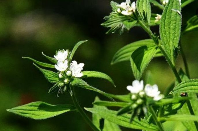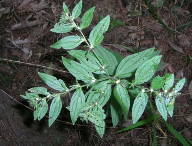 잎과 줄기 전체에 흰빛의 거친 털이 빽빽하게 나 있고 잎은 잎자루가 없는 피침꼴로 돌려나기로 난다.