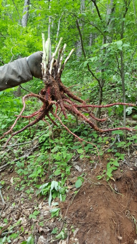 굵은 보랏빛 뿌리가 땅속을 나사처럼 파고 들면서 자라는데 오래 묵은 것을수록 보랏빛이 더 짙다.