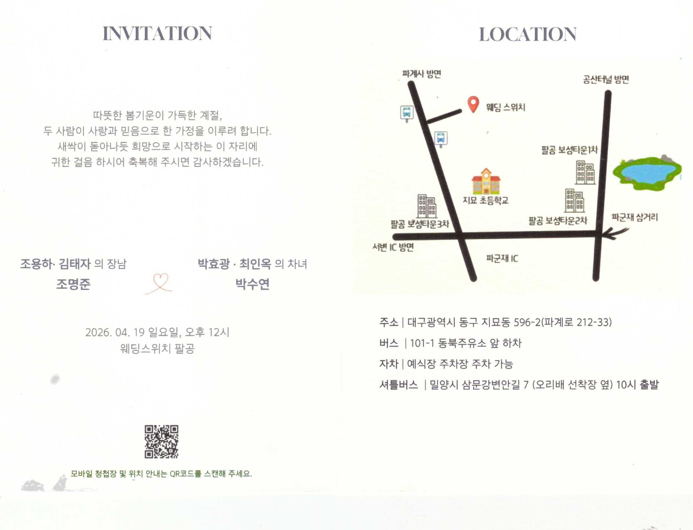 박효광.최인옥 차녀 결혼 청첩장 작성자겨울나그네|작성시간26.03.10|조회수4 목록 댓글 1 글자크기 작게가 글자크기 크게가 다음검색 현재 게시글 추가 기능 열기 북마크 공유하기 신고 센터로 신고 댓글 댓글 1 댓글쓰기 답글쓰기 댓글 리스트 작성자겨울나그네 작성자 본인 여부 작성자 | 작성시간 26.03.10 만물이 소생 하는 좋은 날에 결혼식 축하 드립니다 댓글 전체보기