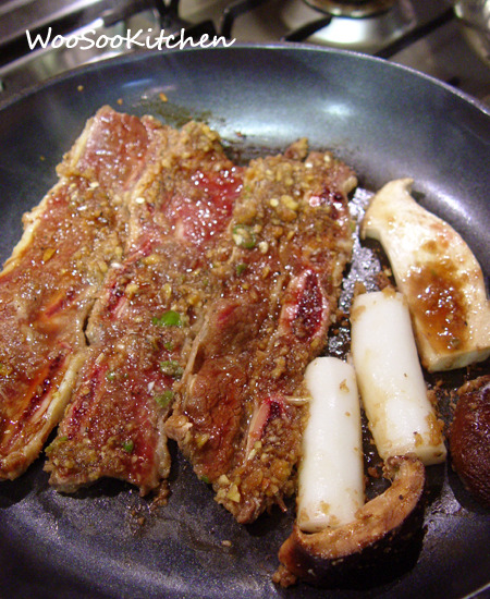 4. 팬을 달구어 준 후 재운 갈비와 떡, 버섯을 노릇노릇하게 구워낸다.