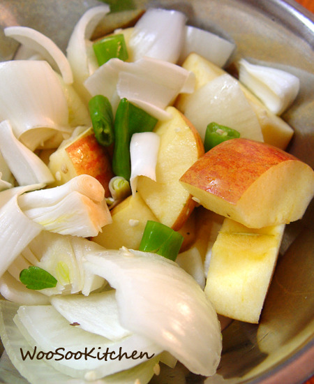 1. 양파와 사과 고추는 믹서기에 중간정도 곱게 갈아준다