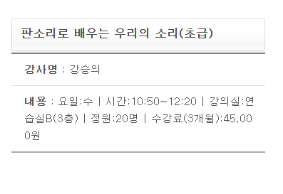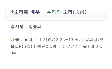 성동문화원 강습안내 작성자둥-둥|작성시간19.03.25|조회수489 목록 댓글 3 글자크기 작게가 글자크기 크게가 성동문화원 강습성동문화원 전통문화강좌 판소리 초급반이 개설 되어 2019년 4월 3일(수) 첫수업이 있습니다.많은 홍보 바랍니다. 다음검색 현재 게시글 추가 기능 열기 북마크 공유하기 신고 센터로 신고 댓글 댓글 3 댓글쓰기 답글쓰기 댓글 리스트 작성자아따맘마 | 작성시간 19.03.26 초급반 개설을 축하드립니다.모두 열공하세요. 작성자다래꽃 | 작성시간 19.03.26 초급반 개설은 축하드립니다 작성자두더지 | 작성시간 20.04.03 축하합니다 열공하세요 댓글 전체보기