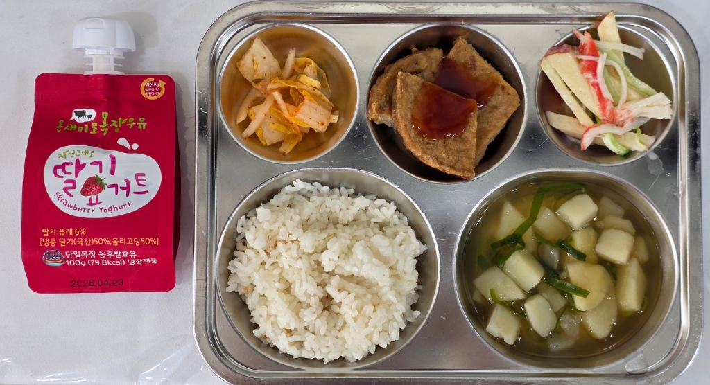 4월 14일 식단 작성자사랑반 교사 임서희|작성시간26.04.14|조회수10 목록 댓글 0 글자크기 작게가 글자크기 크게가 율무밥감자국검은깨우리콩두부스테이크크래미사과샐러드김치딸기요거트 다음검색 현재 게시글 추가 기능 열기 북마크 공유하기 신고 센터로 신고 댓글 댓글 0 댓글쓰기 답글쓰기 댓글 리스트