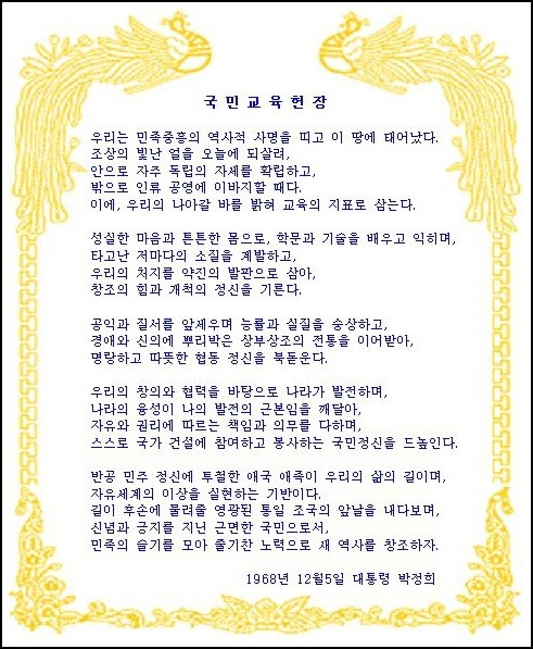 중고교생들도 암기해야 했던 것은 물론(모든 교과서 앞머리에 실리기도 했다)