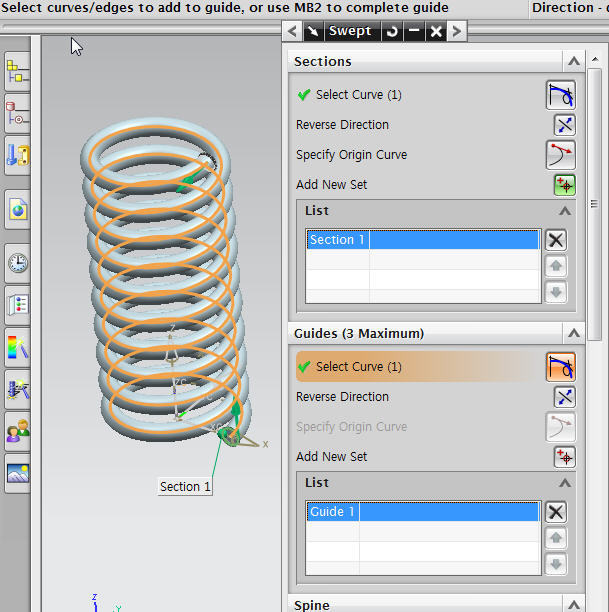단면 섹션엔 스케치로 그린 원을, 가이드엔 헬릭스를 리스트로 등록 후 OK.