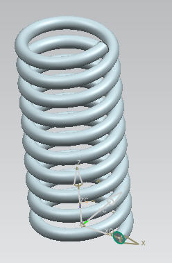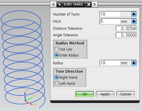 Insert/Curve/Helix를 이용하여 5mm피치로 10바퀴도는 직경10mm짜리 Helix를 원점을 기준으로 Z축 따라 생성.