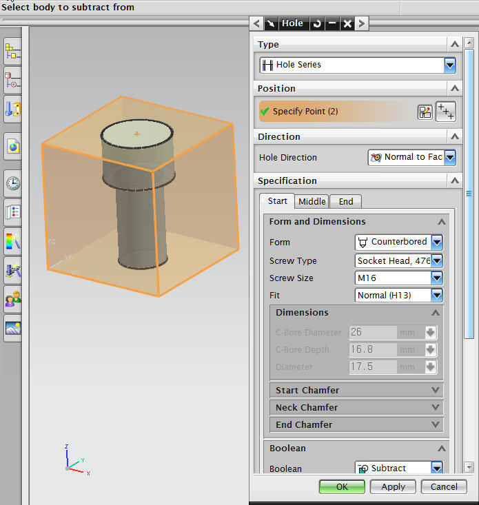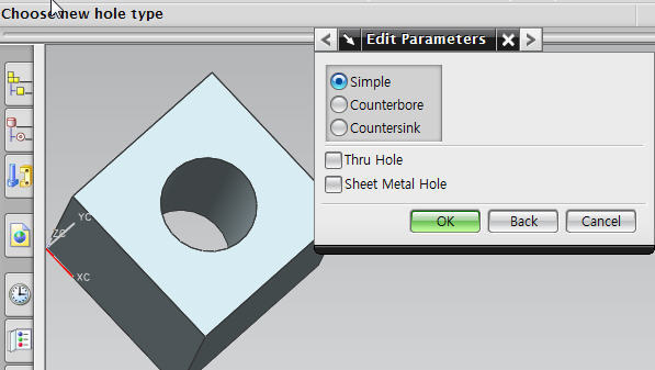 3) 단순 홀, 카운터보어형 홀, 카운터싱크형 홀 요렇게 3가지 타입 중 원하는 걸 선택한 다음