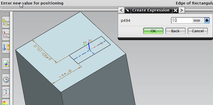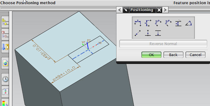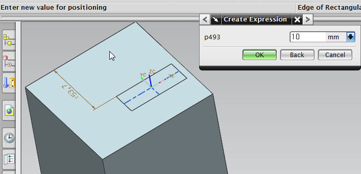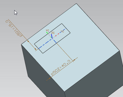 OK한 후, 다시 한번 Perpendicular를 이용해 포켓의 다른 한쪽 변과의 거리를 지정할 요소를 선택(여기서는 블록의 왼쪽 모서리)한 후 거리값 입력.