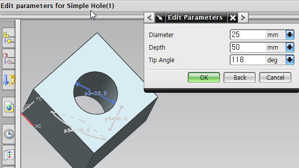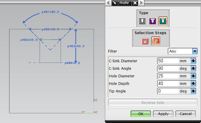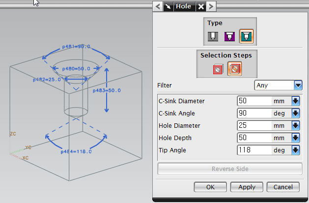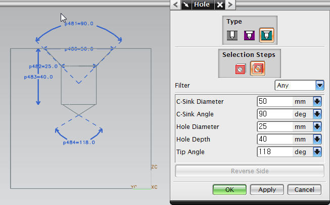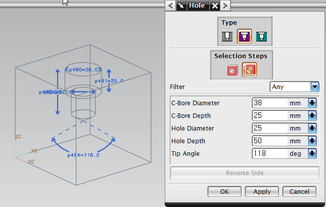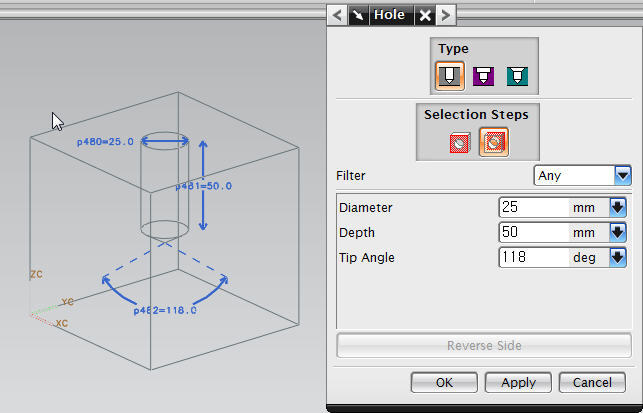 홀 밑이 평평한 구멍을 뚫으려면 Tip Angle을 0으로...