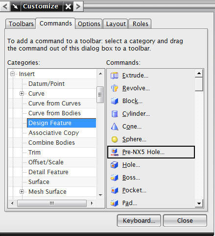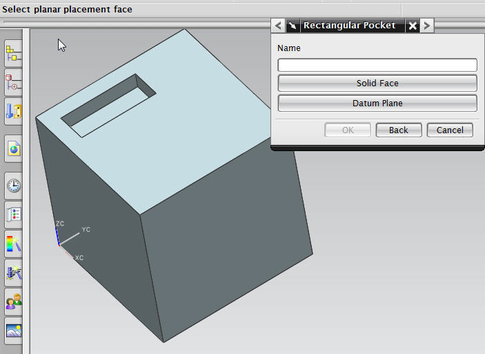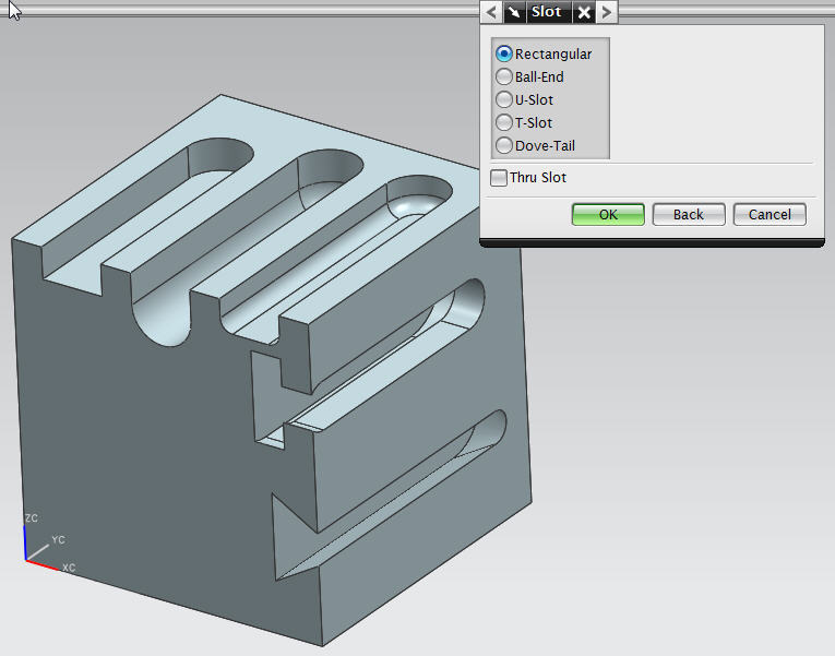 홀, 포켓, 슬롯, 패드, 보스, 그루브 등은 드릴, 밀링, 선반 등 절삭기류로 가공될 수 있는 형상들로 Insert/Design Feature 메뉴에 얘들이 몰려있음. 얘들을 잘 사용해서 솔리드 형상을 잘 깍아나가기만 하면, 구지 스케치로 삽질할 필요없이 절삭 가공물 형태의 3D 형상을 얼마든지 만들어 낼 수 있다.