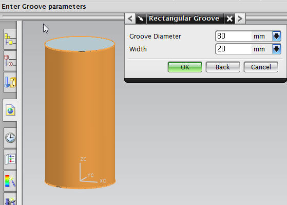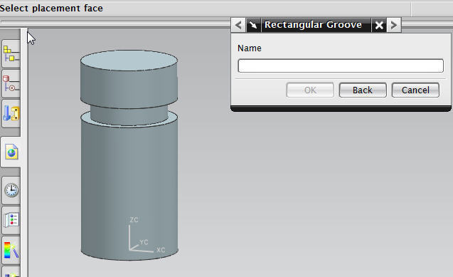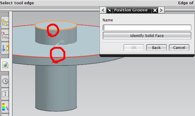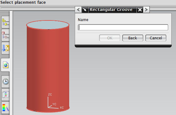 그루브 타입 설정하면 다음은 그루브를 파낼 원통면을 선택. Name 어쩌구 대화상자는 무시하고 마우스로 선택.