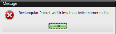 만일 R값 입력 시 라운딩코너의 직경이 포켓의 너비나 깊이보다 크다면 요런 에러메세지가 뜸.
