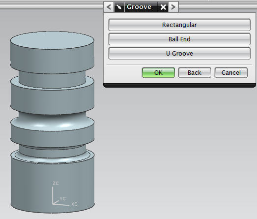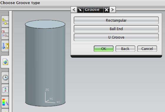 Groove 명령을 실행하면 Rectanglular, Ball End, U Groove 세가지 타입 중 하나를 선택하라고 함.