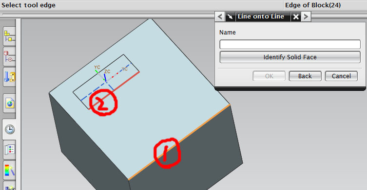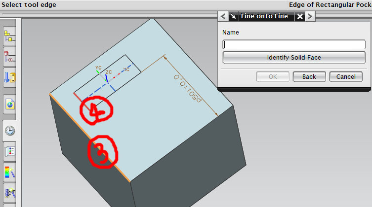 Line onto Line의 사용방법은 일치시킬 모서리와 포켓의 변을 차례로 마우스로 선택하기만 하면된다.(순서는 모서리부터 선택해야함. 포켓의 변은 그 후에)