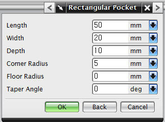 만일 포켓을 파낸 안쪽 코너에 라운드를 넣으려면 Corner Radius에 R값 입력.