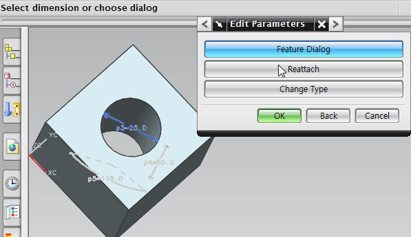 특징형상을 수정하려면, 바디에서 특징형상으로 만들어진 부분을 더블클릭하던가 아니면 히스토리에서 선택해서 들어가면 됨.