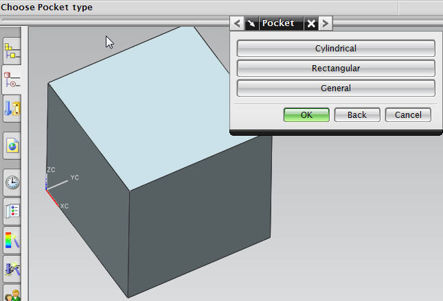포켓을 실행하면 3가지 타입을 선택하라는데, 실린더 타입은 그냥 구멍이므로 앞서 살펴본 hole명령을 이용해 파내면 됨.