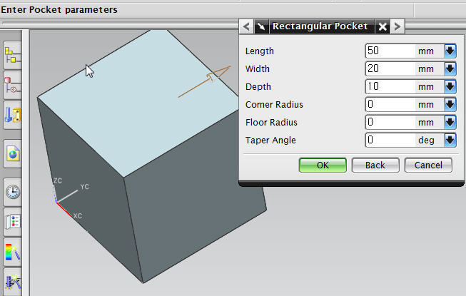 포켓의 크기를 위와 같이 지정했으면 OK를 누르고, 포켓의 위치를 지정.