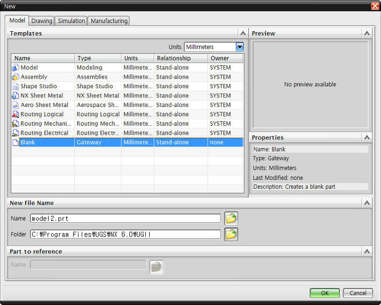 New 시작부터 모델링, 어셈블리, 세이프 등 작업관련 인터페이스를 선택할 수 있는데 일반적으로 blank를 지정해놓고 시작함.