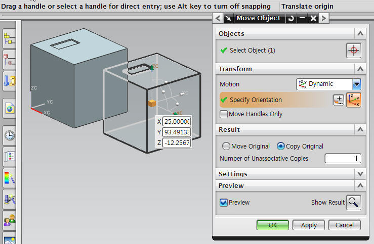 New -> 파트생성 -> Start/Modeling -> Insert/Design Feature/Block을 실행해서 Box 하나 만들고 위 조작을 연습해볼 것!