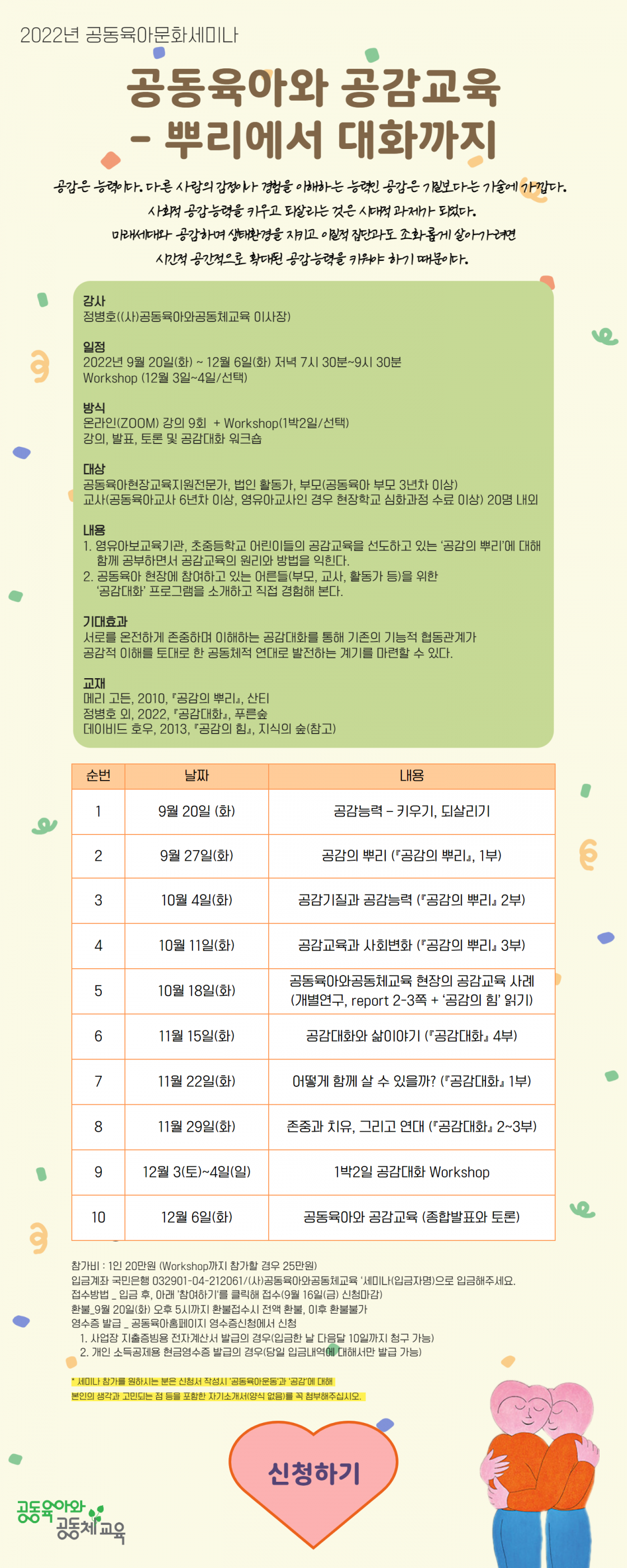 [공동육아교육연구원] 2022년 문화세미나 '공동육아와 공감교육 - '뿌리에서 대화까지'를 진행합니다. 작성자공동육아 사무국|작성시간22.08.25|조회수25 목록 댓글 1 글자크기 작게가 글자크기 크게가 https://www.gongdong.or.kr/bbs/board.php?bo_table=B211&wr_id=3790 공동육아와공동체교육공동육아와공동체교육, 공동육아어린이집, 초등방과후, 사회적협동조합, 협동어린이집, 공동육아협동조합www.gongdong.or.kr 다음검색 현재 게시글 추가 기능 열기 북마크 공유하기 신고 센터로 신고 댓글 댓글 1 댓글쓰기 답글쓰기 댓글 리스트 작성자좋아 | 작성시간 22.08.25 세미나 정보 감사합니다 ^^ https://cafe.naver.com/sungmisankids/428성미산어린이집 카페가 이전 하였습니다. 새로운 카페에 글 올려주시면 전조합원이 올려주시는 정보를 원활하게 확인할 수 있을 것 같습니다 ^^ 댓글 전체보기