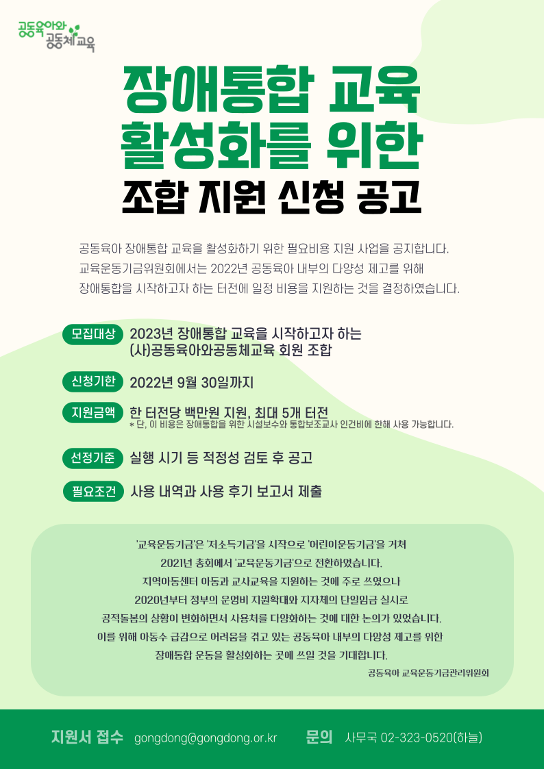 공동육아 장애통합 교육 활성화를 위한 조합 지원 신청 공고 작성자공동육아 사무국|작성시간22.09.08|조회수27 목록 댓글 0 글자크기 작게가 글자크기 크게가 [서식]2022 통합교육 신청서.hwp48.00KB 첨부파일첨부된 파일이 2개 있습니다. png 파일 KakaoTalk_20220908_095905139.png 다운로드 hwp 파일 [서식]2022 통합교육 신청서.hwp 다운로드 다음검색 현재 게시글 추가 기능 열기 북마크 공유하기 신고 센터로 신고 댓글 댓글 0 댓글쓰기 답글쓰기 댓글 리스트
