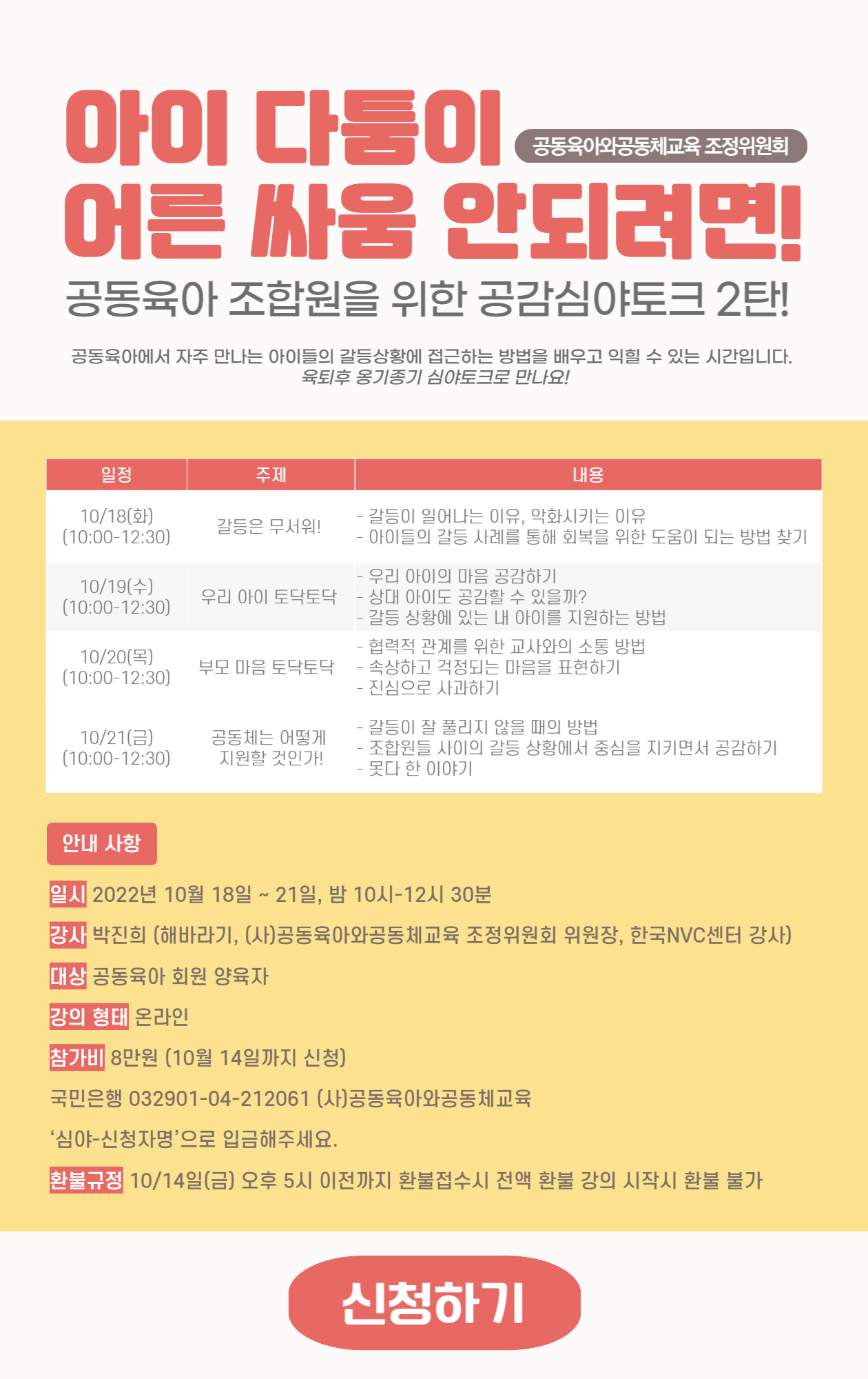 [공동육아조정위원회]아이 다툼이 어른 싸움 안되려면 작성자공동육아 사무국|작성시간22.09.21|조회수21 목록 댓글 0 글자크기 작게가 글자크기 크게가 https://forms.gle/yuzZpWCGoKy9MEMPA"아이 다툼이 어른 싸움 안되려면" 아이들의 갈등다루기 - 양육자편 참가신청서< 아이 다툼이 어른 싸움 안되려면 - 양육자 편 > * 일정 : 2022년 10월 18일 - 10월 21일 10:00-12:30 (2시간 30분*4회) * 강사 : 박진희 (해바라기, (사)공동육아와공동체교육 조정위원회 위원장, 한국NVC센터docs.google.com 다음검색 현재 게시글 추가 기능 열기 북마크 공유하기 신고 센터로 신고 댓글 댓글 0 댓글쓰기 답글쓰기 댓글 리스트