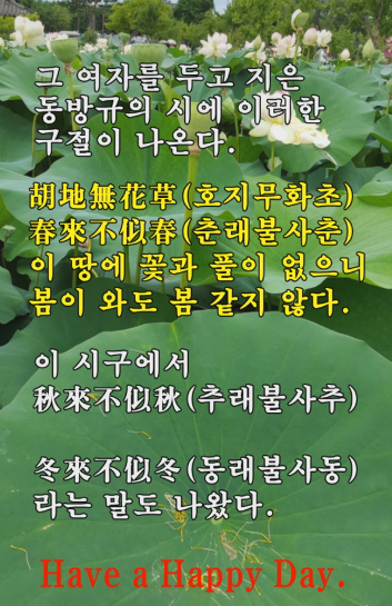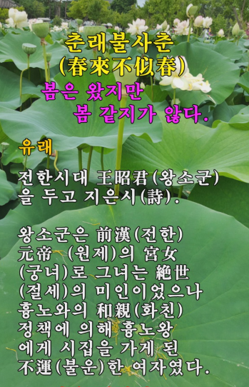 ♣ 춘래불사춘(春來不似春) ♣ 춘래불사춘(春來不似春)은 봄이 와도 봄같지 않다는 뜻입니다. 중국 전한(前漢)의 원조(元祖)때의 일인데 왕소군(王昭君)에게는 봄은 봄이 아니었습니다. 한(漢)나라 원제(元帝BC74~BC33)는 색(色)을 밝힌 인물이었습니다. 장안(長安)의 미인이라는 미인은 모두 궁(宮)으로 불러들여 궁녀로 삼았습니다. 그렇게 들인 여인이 3000여명. 원제는 궁녀를 매일밤 바꿔 가며 밤을 보냈습니다. 고르는 것에 지친 그는 화공 모연수(毛延壽)에게 궁녀들의 초상화를 그리도록 했습니다. 그림을 보고 여인을 간택하기 위해서였습니다. 이중에는 왕소군(王昭君)이라는 이름의 궁녀도 있었습니다. 절세 미인이 따로 없었습니다. 후대인들은 중국 전한(前漢) 시대 원제(元帝)의 궁녀였던 왕소군과 춘추전국시대의 서시(西施), 삼국시대의 초선(貂蟬), 당나라의 양귀비(楊貴妃)와 더불어 중국 고대의 4대 미인이라고 부를 정도였습니다. 왕소군은 이미 고령이 된 원제에게 눈에 띨려고 노력하지도 않았습니다. 돈도 없었지만 자신의 미모에 자신만만했기 때문이었습니다. 괘씸하게 여긴 모연수는 왕소군을 가장 못나게 그려 바치고 말았습니다. 다른 궁녀들은 모연수에게 돈을 줘가며 잘 그려달라고 매달렸지만 왕소군은 그렇게 하지 않았습니다. 당연히 그림 속의 얼굴은 미인(美人)과는 거리가 먼 추녀(醜女)중에 추녀였습니다. 어느 날, 북방의 흉노족 족장이 '원제'를 찾아 와 '한족' 여인을 아내로 삼게 해 달라고 요구했습니다. 걸핏하면 쳐내려오는 흉노족을 달래기 위해 한(漢)나라 원제(元帝)는흉노 왕에게 반반한 궁녀 하나를 주기로 약속했습니다. 누구를 보낼 것인가 생각하다가 '원제'는 궁녀들의 '초상화집' 을 가져오게 해서 쭉 훑어봤습니다. 그 중 가장 못나게 그려진 왕소군을 찍었습니다. 며칠 후, 작별 인사 차 온 왕소군을 보고는 깜짝 놀랐습니다. 그림과는 달리 절세 미인이었던 때문이었습니다. 오랑캐땅으로 떠나는 왕소군의 실물을 본 원제는 땅을 치고 후회했습니다. 그러나 이미 때는 늦었습니다. 모연수의 비리 행각을 알게 된 원제는 그 자리에서 그의 목을 잘랐습니다. 기원전 33년, 클레오파트라가 자살하기 3년전 정략(政略)의 도구가 된 궁녀(宮女) 왕소군은 이렇게 흉노(匈奴)의 왕(王)에게 억지로 시집을 갑니다. 이국 땅으로 떠나가는 날...왕소군은 고향 생각이 나 금(琴)을 연주합니다. 아름다운 선율이었습니다. 한 무리 기러기가 날개짓을 잊고 그만 땅으로 고꾸라질 정도였다고 합니다. 낙안(落雁)이란 떨어질 낙(落)자에 기러기 안(雁)자를 쓰는데 그래서 왕소군을 낙안(落雁)이라 칭하였다고 합니다. 훗날 많은 화가들이 왕소군을 그렸고 시인들은 그의 애달픈 삶을 노래했다고 합니다. 그 중에서도 잘 알려진 게 바로 당(唐)나라 '측천무후'의 '좌사(左史)' 였던 '동방규'가 쓴 ‘소군원삼수(昭君怨三首)’ 입니다. 오랑캐 땅에는 꽃도 풀도 없어(胡地無花草) 봄이 왔으되 봄같지 않구나(春來不似春) 나도 모르게 옷 띠가 느슨해졌나니(自然衣帶緩) 몸이 약해진 때문만은 아니리니(非是爲腰身) 이 시에서 ‘춘래불사춘(春來不似春)’이라는 말이 나옵니다. 다시 말해 '춘래불사춘'은 중국 당나라 시인 '동방규(東方규)' 의 시 '소군원(昭君怨)' 에서 유래한 말입니다. 요즘 봄은 왔어도 봄같지가 않습니다. 시국이나 경제 또한 어수선 하기만 합니다. 거기다가 온 산하가 산불 화마(火魔)로 뒤덮히는 형국이니 봄꽃이나 제대로 피어 날런지 모르겠습니다. 모든것이 그저 답답하기만 합니다. -모셔온 글- |