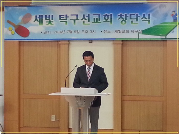 창단식은 세빛교회 담임이신 박상규 목사님의 새로운 전도전략의 하나로 강력하게 추진하고 있는 세빛탁구선교회는 교회의 강력한 지원 아래 안양성결교회를 섬기고 있는 김일승 집사를 섭외하여 레슨 및 초대회장으로 추대하고 임명장을 수여하였다.