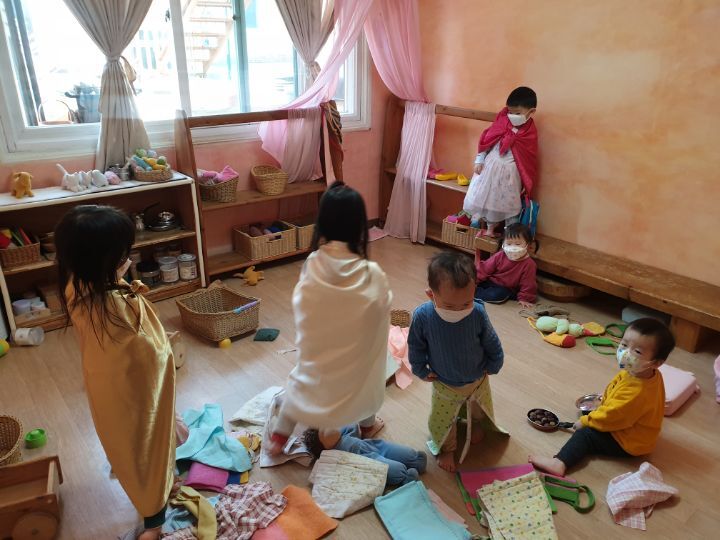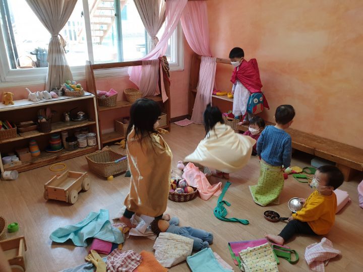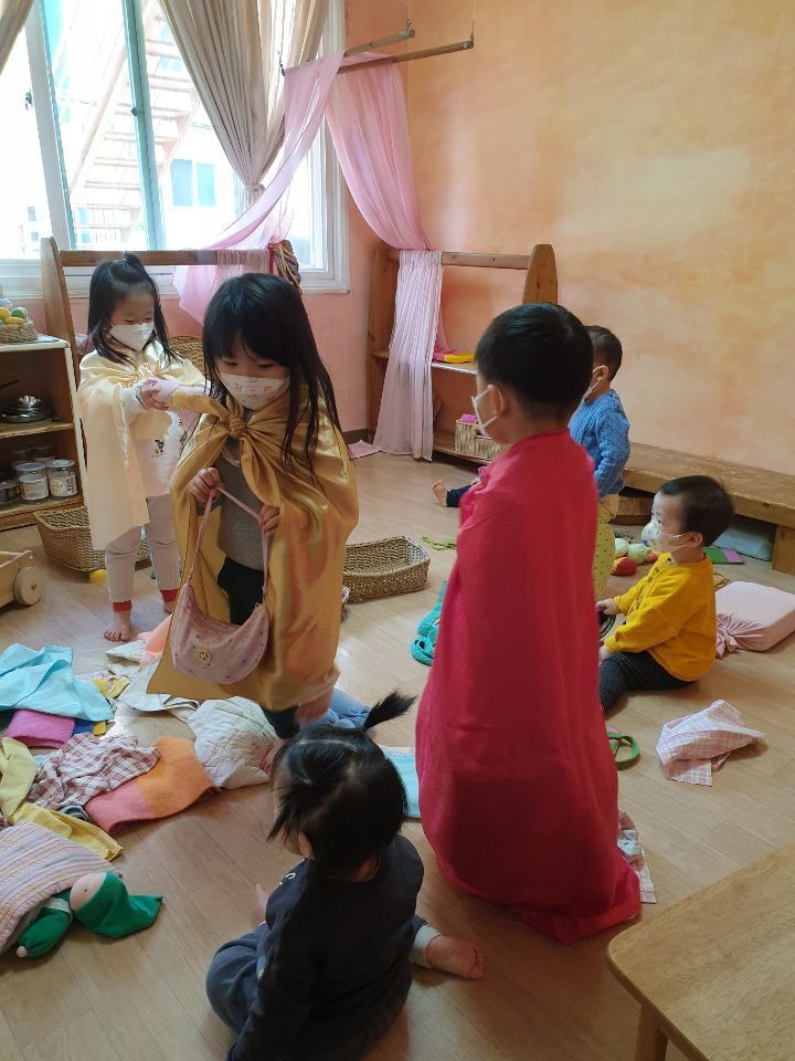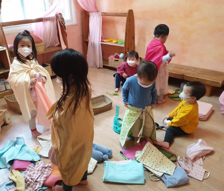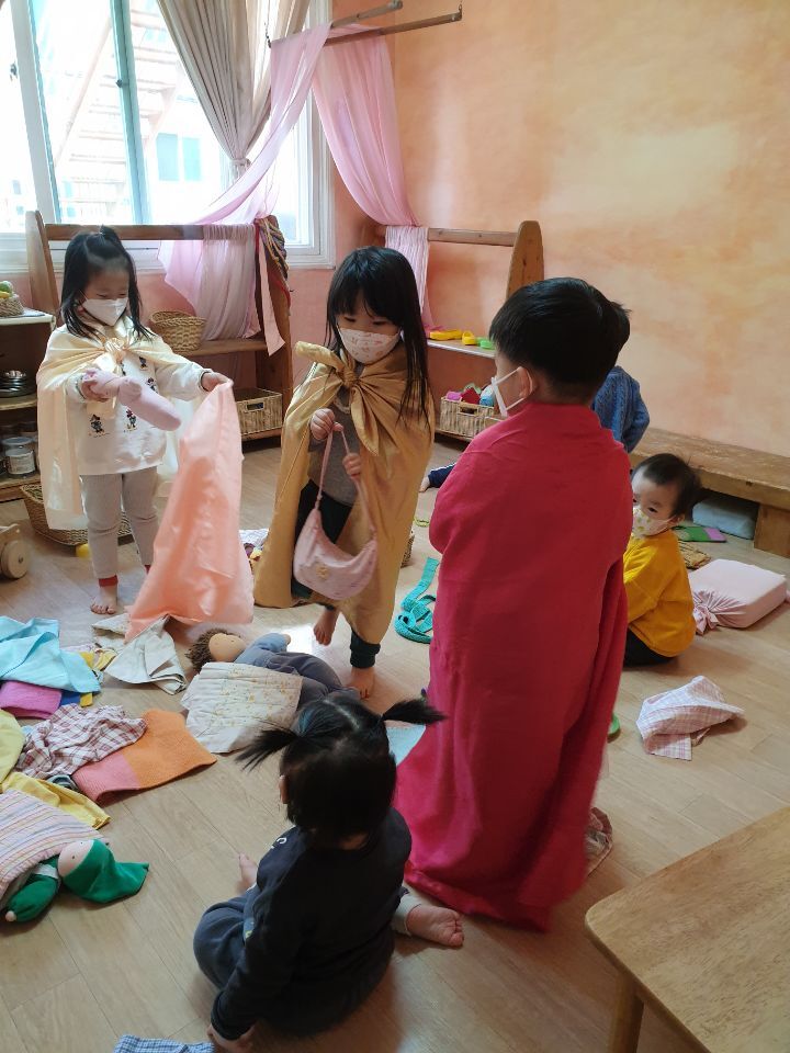 천으로 옷을 만들어 입고 가방에 신발, 너도밤, 블록을 넣어서 메고 다녀요.
