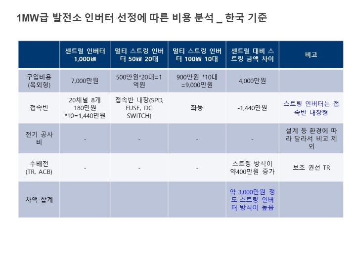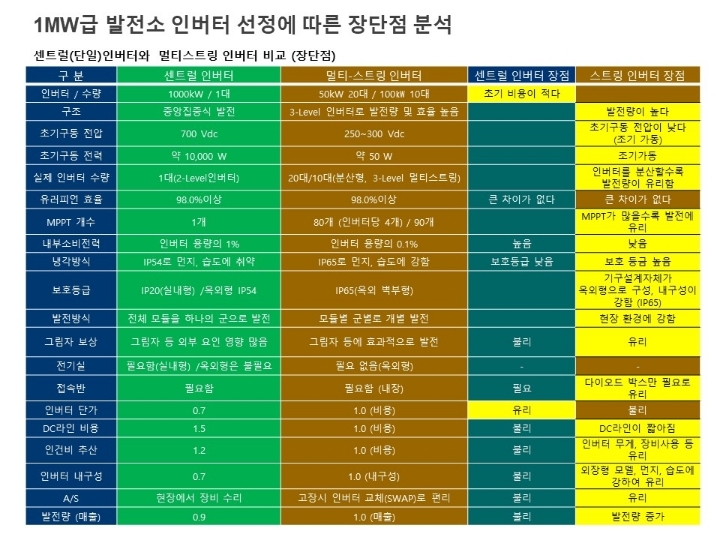 1MW발전소의 경우 인버터를 1000kW 1대로 설치하는냐? 50kW 20대 또는 100kW 10대로 할것이냐? 고민도 많고 선호하는 방식도 다른데요.